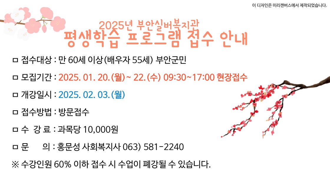 | 2025년 노년사회화교육(평생학습) 프로그램 강사 추가 모집 (0) | 2025.01.14 |