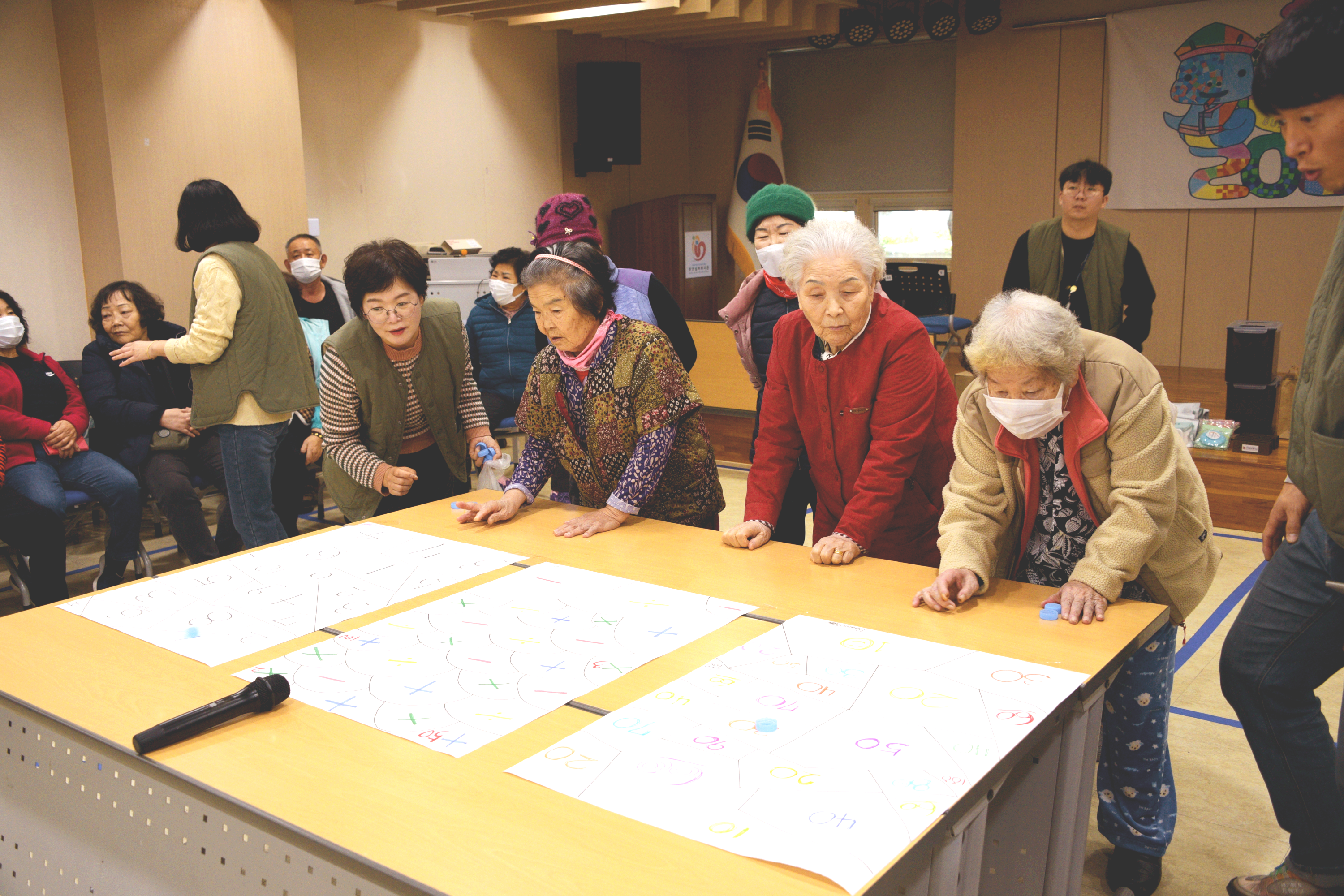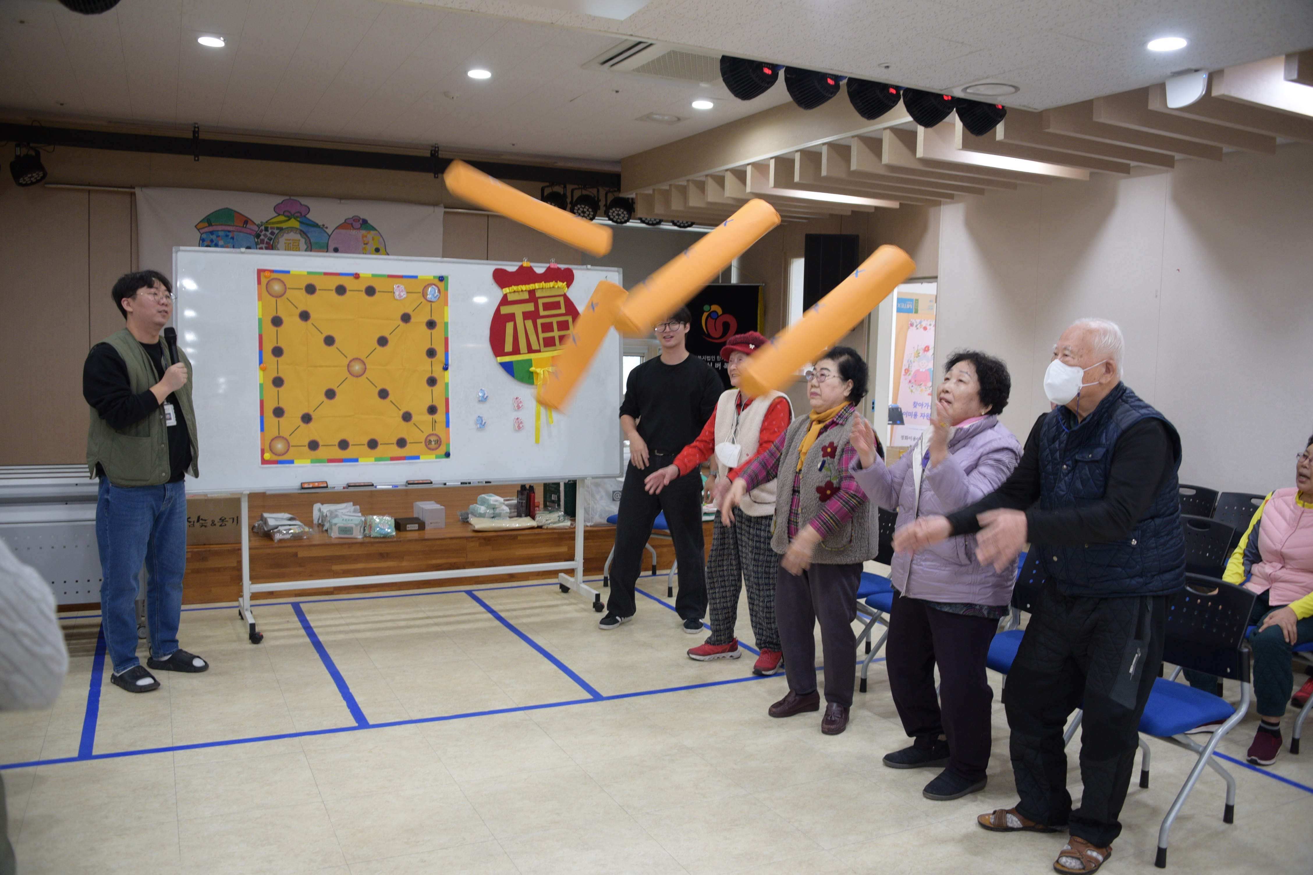 세배에 이어 전통놀이 한마당이 진행되었습니다. 사랑, 나눔, 섬김, 행복 네 팀으로 나눠 윷놀이, 사방치기 등 전통놀이를 가볍고 쉬운 방법으로 바꿔 진행하여 어르신들 모두가 열정적으로 참여하였습니다. 마지막으로 마련된 노래맞추기 시간에는 어르신 전체가 한 목소리로 노래 부르며 화합의 시간이 되었습니다.