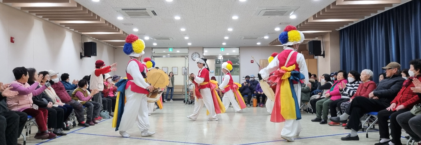 오후에는 세배행사와 즐거운 전통놀이 한마당이 열렸습니다. 부안 전통예술원 타무 농악단의 신명 나는 공연으로 시작되었는데요, 흥겨운 풍물소리에 어르신들도 박수를 치며 함께 즐겼습니다.