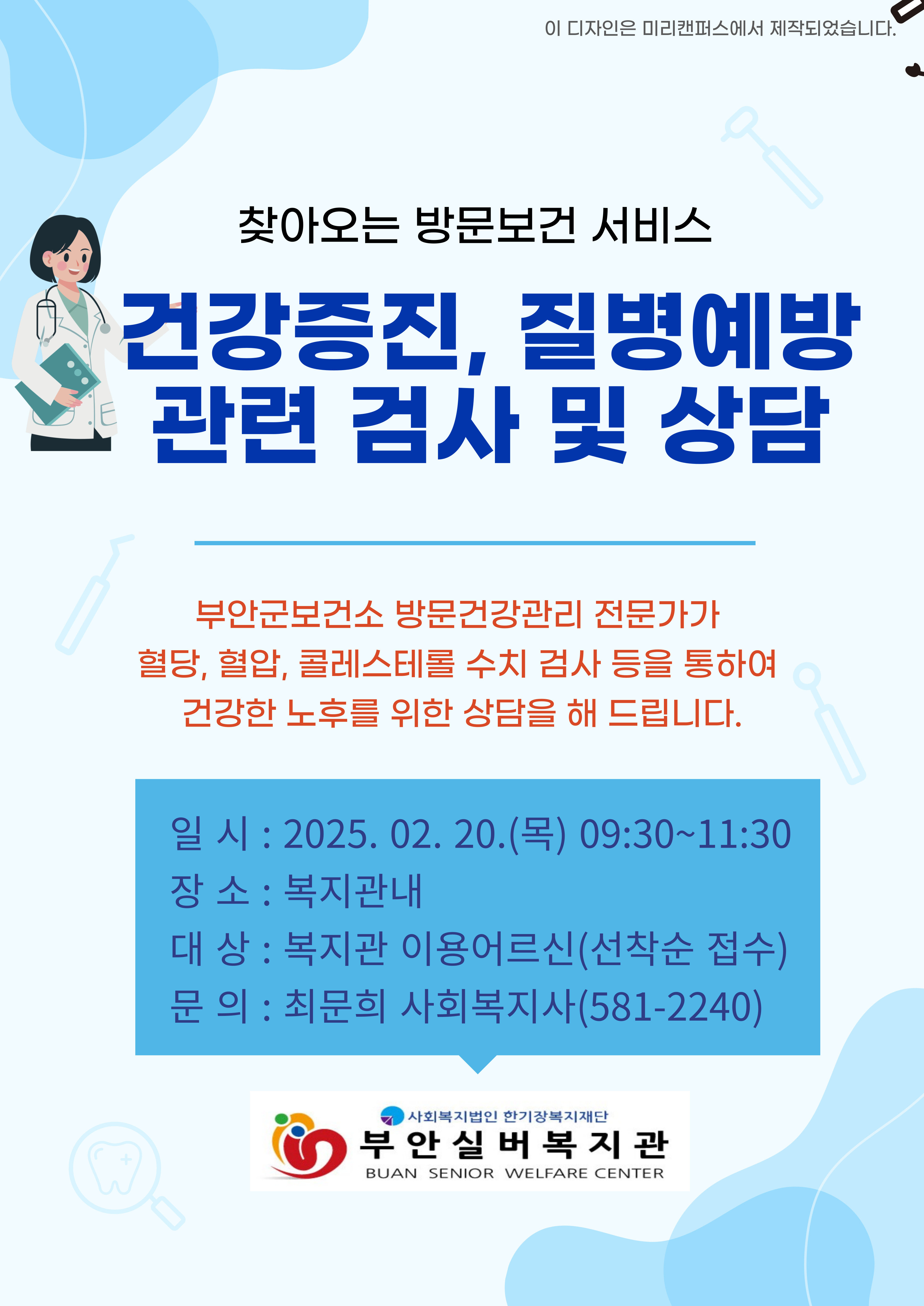 | 찾아오는 방문보건 서비스 - 인지선별검사 및 상담 참여자 모집 (0) | 2025.02.07 |