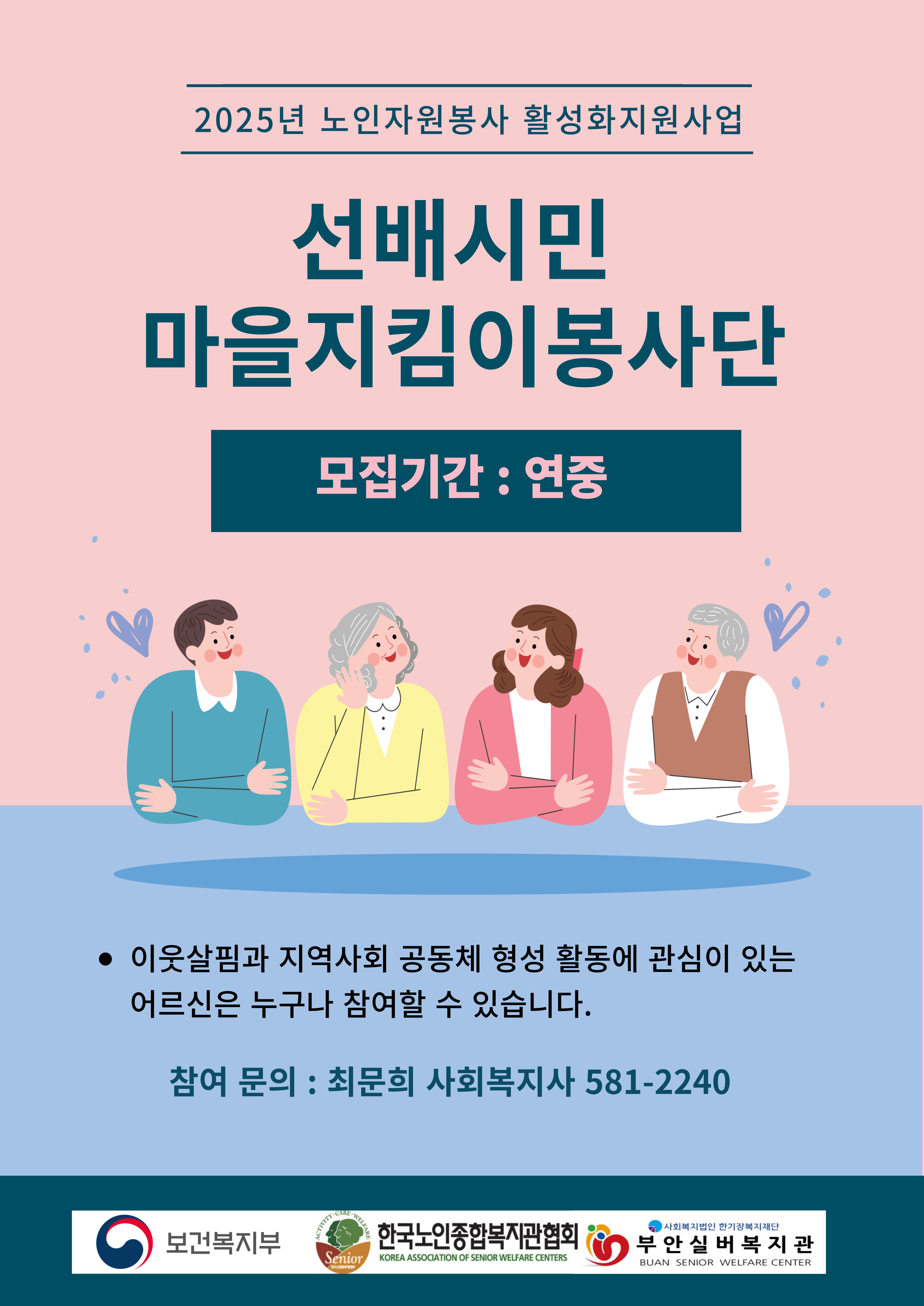 | 2025년 어르신 자원봉사자 모집 안내 (0) | 2025.02.21 |