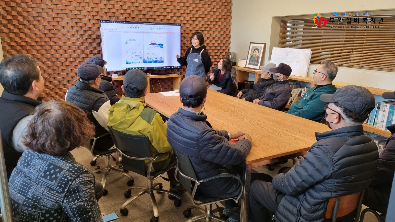 ‘줄포만하’는 어린이들을 위한 환경교육과 건축학교를 진행하는 교육의 장으로도 활용되고 있습니다. 시니어 그룹을 위한 활동을 기획하고 있는 단계에 있다며 용감한 형제들의 방문을 더욱 반겼습니다. 이 날은 자원재활용 활동을 꾸준히 해 온 용감한 형제들 어르신들을 위해 2월 중에 있는 ‘세계 고래의 날 (2월 셋째 주 일요일)’, ’국제 북극곰의 날 (2월 27일)’에 관한 소개와 함께 그림책을 읽으며 해양쓰레기 문제와 탄소중립 실천방안에 대해 이야기 나눴습니다.