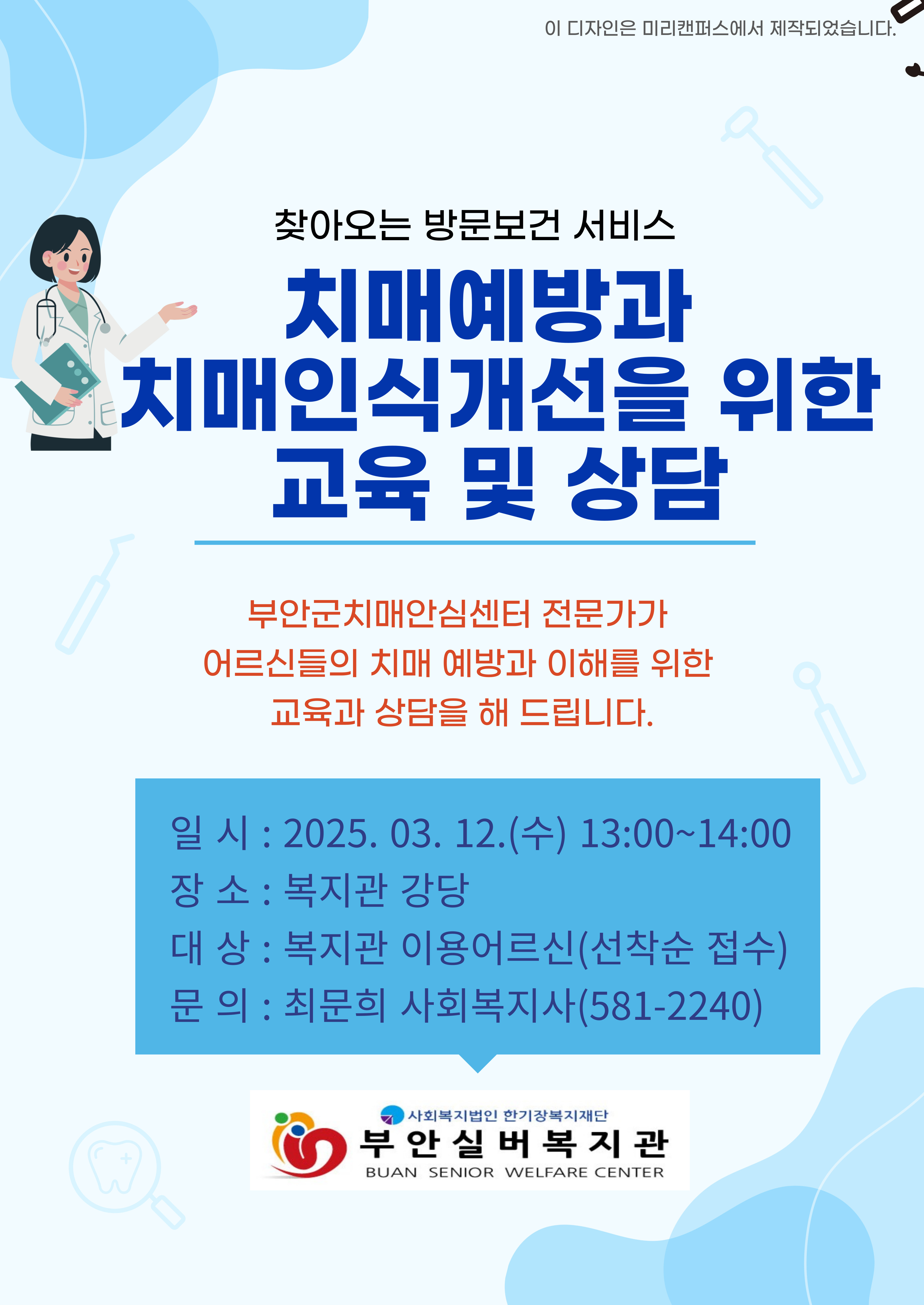 찾아오는 방문보건 서비스(치매예방과 치매인식개선을 위한 교육 및 상담)