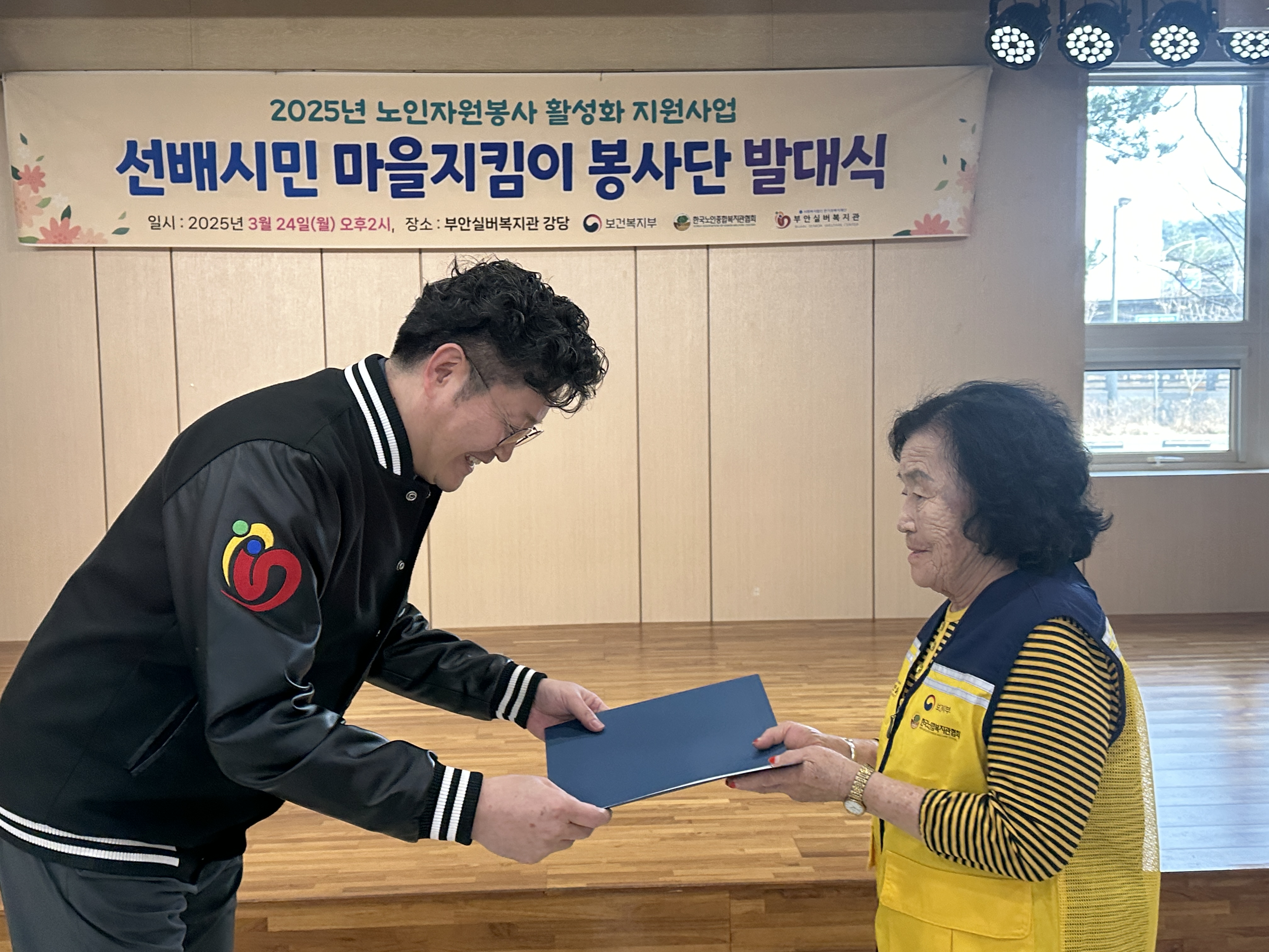 2025년 노인자원봉사 활성화 지원사업  '선배시민 마을지킴이 봉사단(이하 마을지킴이봉사단)' 발대식이 3월24일 부안실버복지관 강당에서 진행되었습니다. 마을지킴이봉사단 참여자 어르신은 총 23명으로, 발대식에서는 임명장 수여 및  2025년 활동 계획에 대한 설명, 봉사단원들의 활동 각오 등을 나누는 시간을 가졌습니다.
