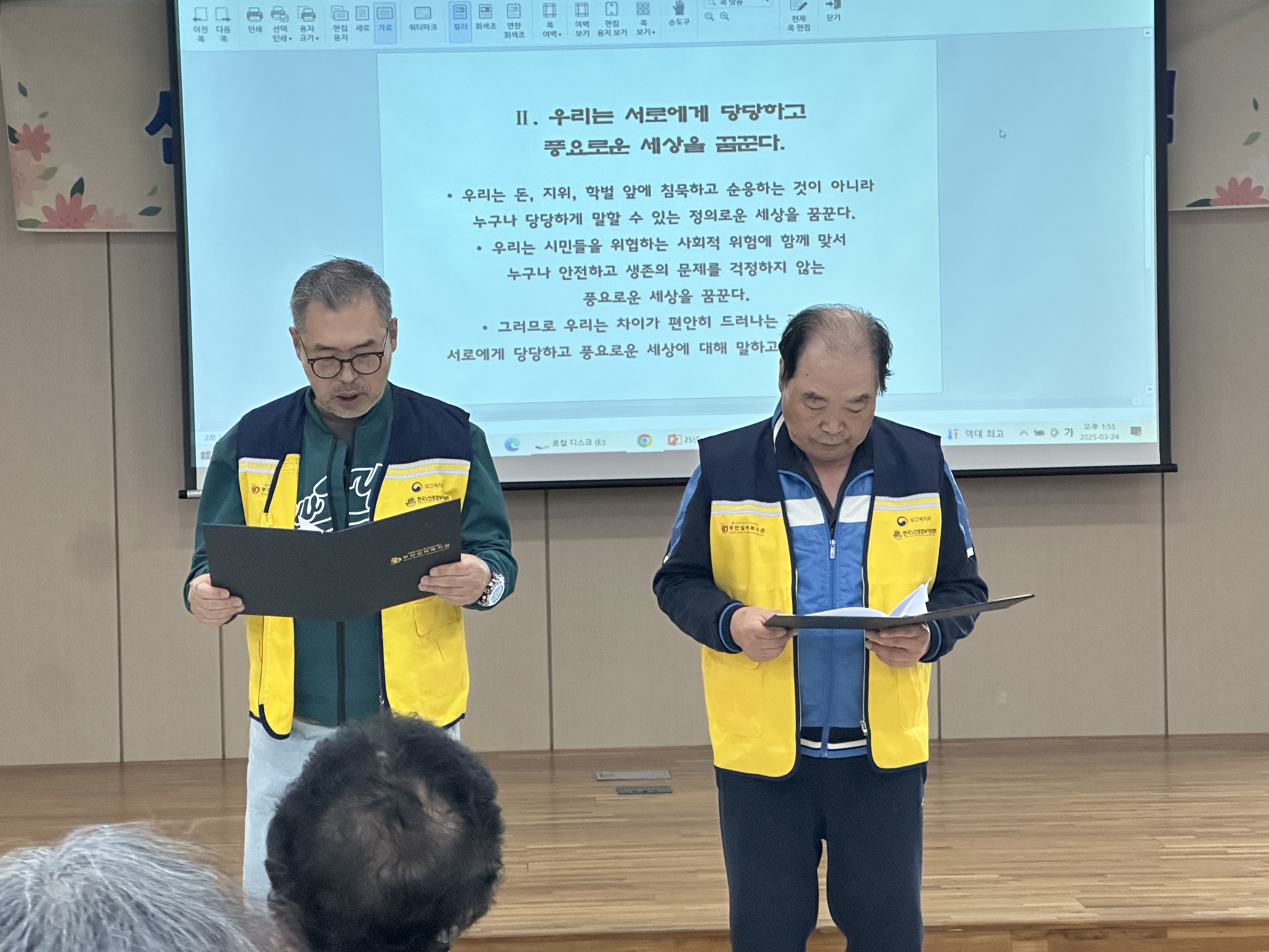 2025년 노인자원봉사 활성화 지원사업 '선배시민 마을지킴이 봉사단(이하 마을지킴이봉사단)' 발대식이 3월24일 부안실버복지관 강당에서 진행되었습니다. 마을지킴이봉사단 참여자 어르신은 총 23명으로, 발대식에서는 임명장 수여 및 2025년 활동 계획에 대한 설명, 봉사단원들의 활동 각오 등을 나누는 시간을 가졌습니다.