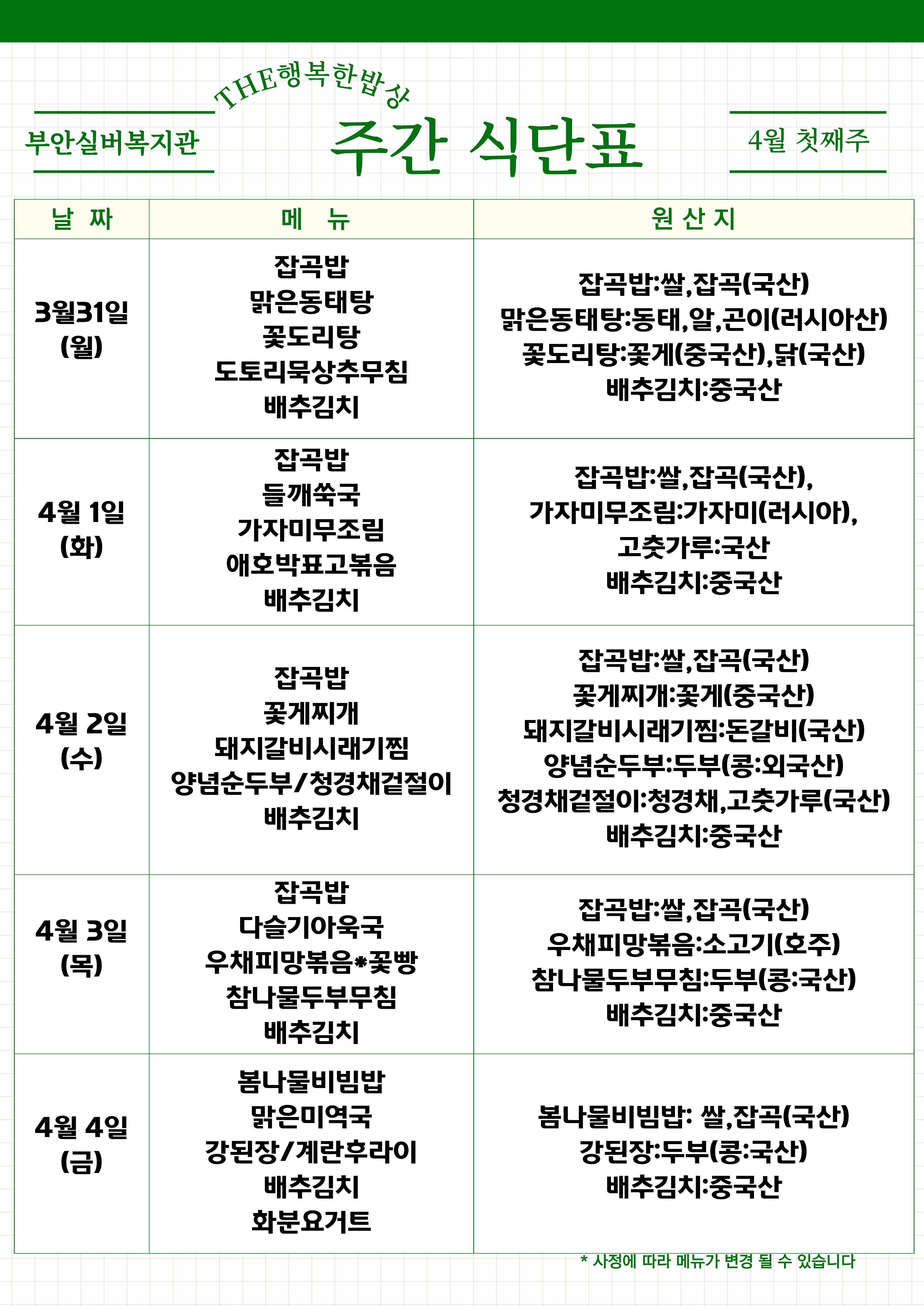 *상기 식단은 식재료 사정 및 식품 수급에 따라 변경 될 수 있습니다.