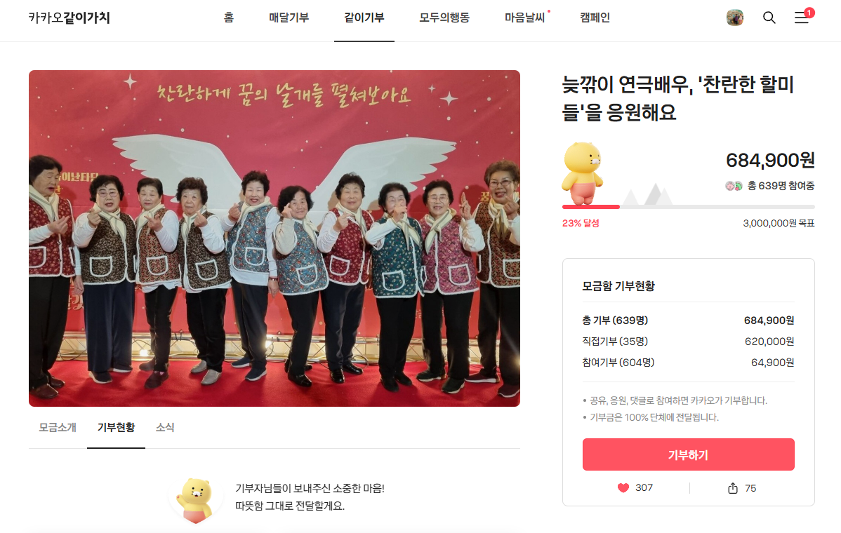 부안실버복지관에서 어르신 연극프로그램 '찬란한 할미들' 카카오같이가치 모금을 진행합니다.