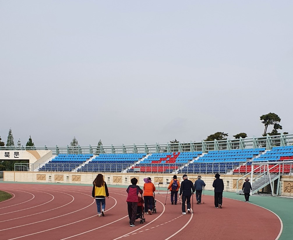 부안복지관 운동장이 잔디로 되어 있어, 실버카를 밀면서 걷기에는 어려움이 있을 것으로 예상되었습니다. 그래서 2팀 모임은 스포츠파크에 있는 트랙을 걸었습니다.
