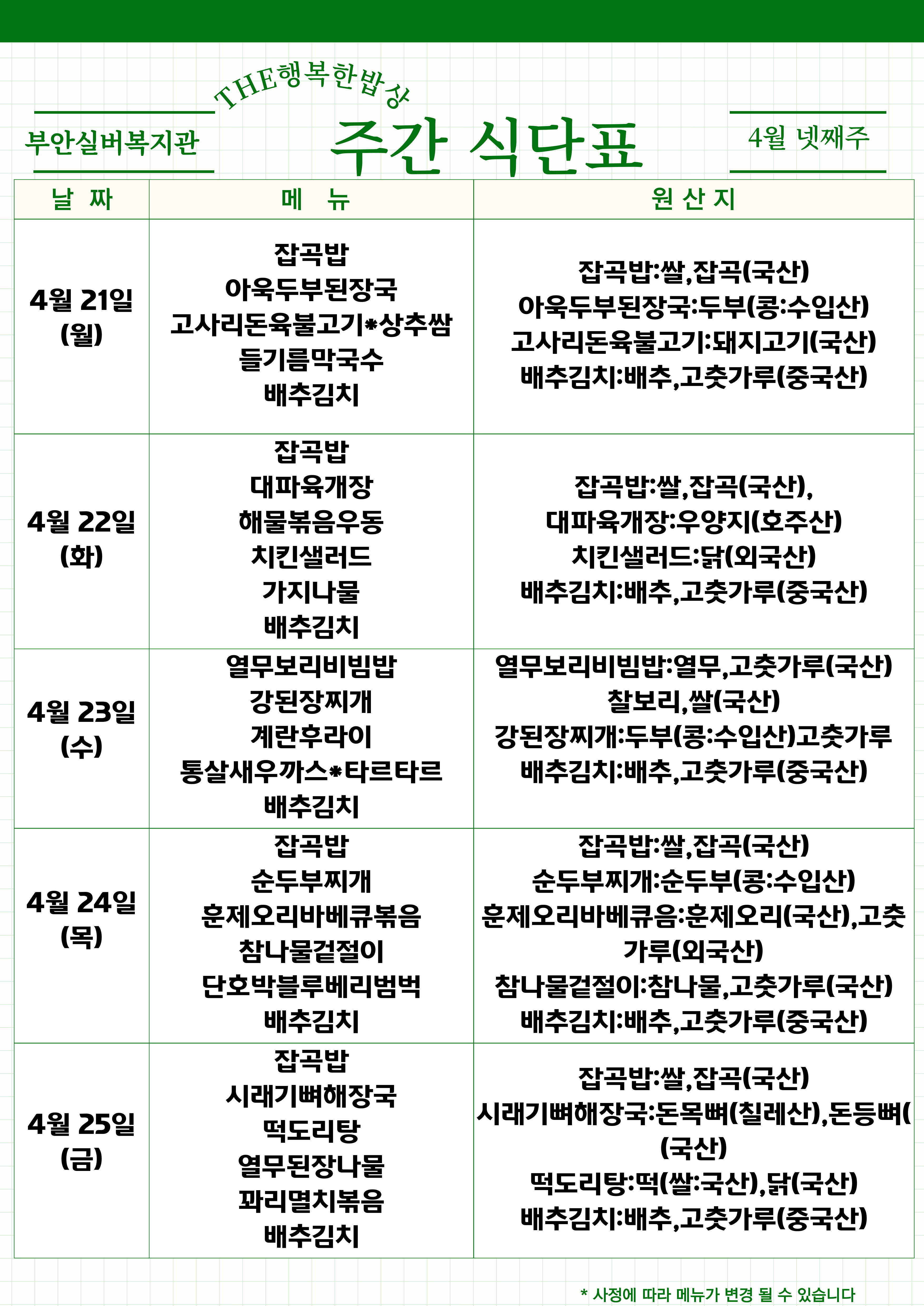 | 복지관 식단표 - 4월 5주 (0) | 2025.04.25 |