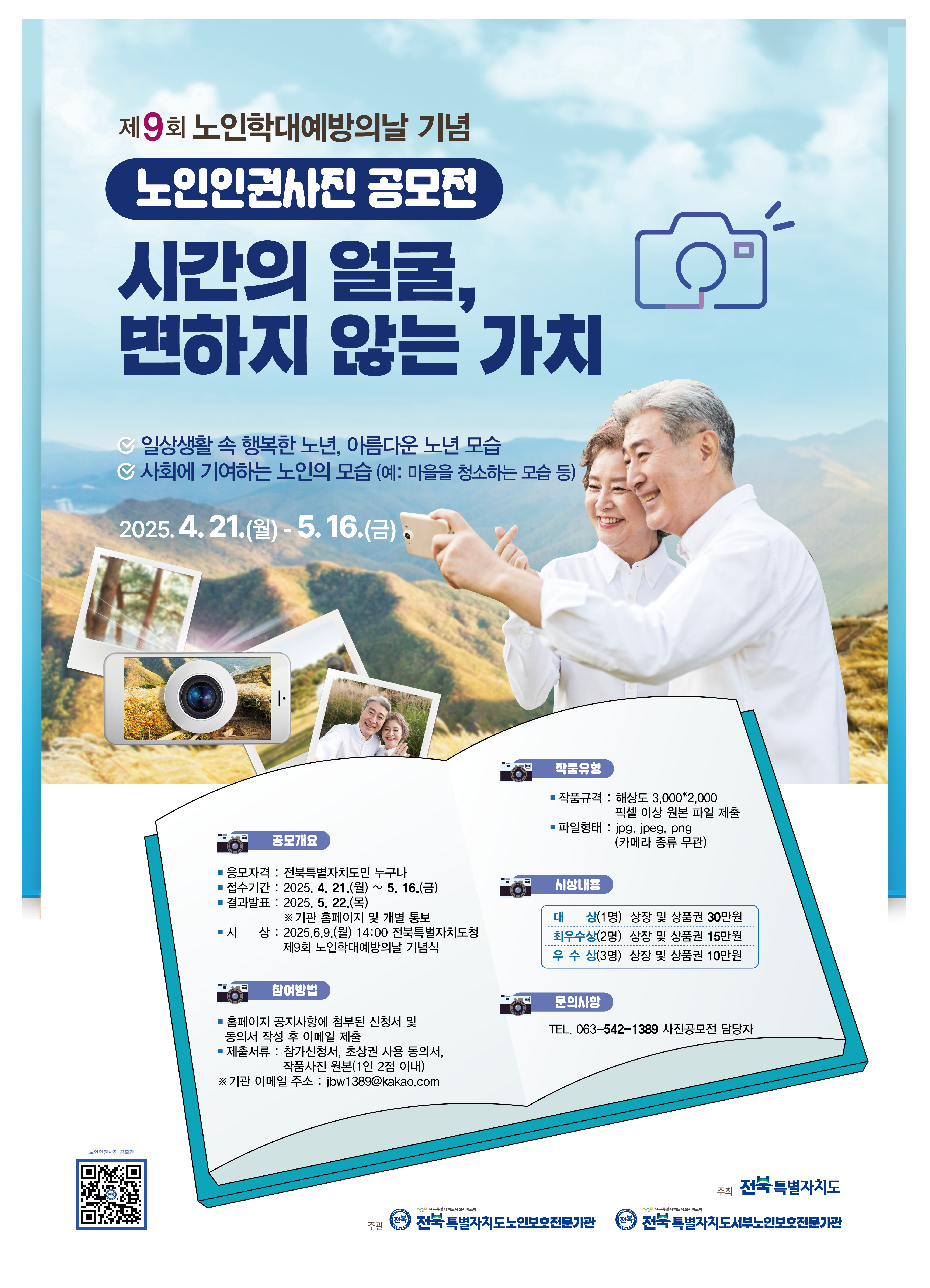 아울러, 제9회 노인학대예방의날을 기념하여 '시간의 얼굴, 변하지 않는 가치' 라는 주제로 노인인권사진 공모전이 열립니다. '일상생활 속 행복한 노년의 모습, 아름다운 노년의 모습, 사회에 기여하는 어르신의 모습' 등 다양한 주제로 사진 공모전이 열리니 지역주민들의 많은 관심과 참여 바랍니다.