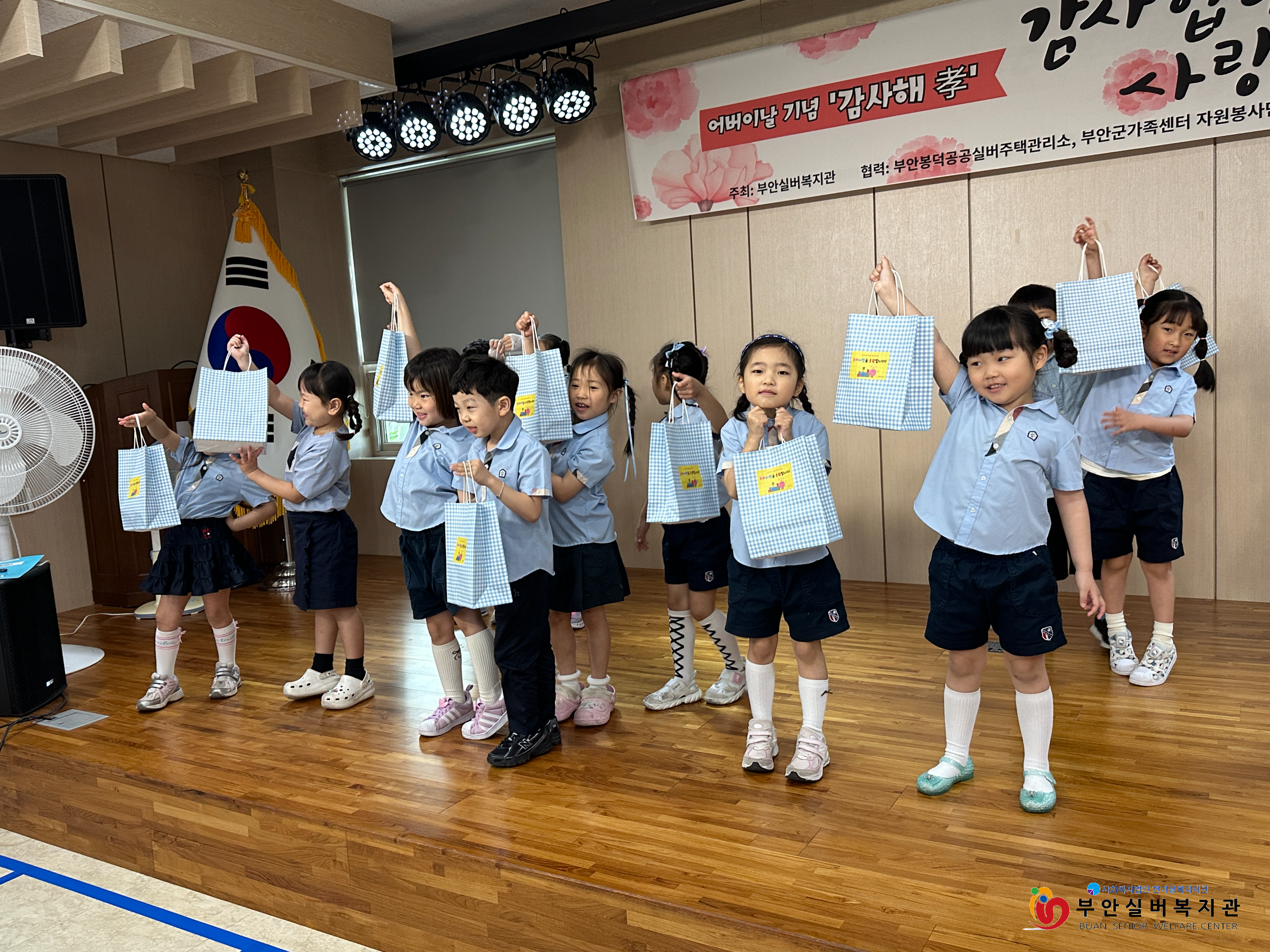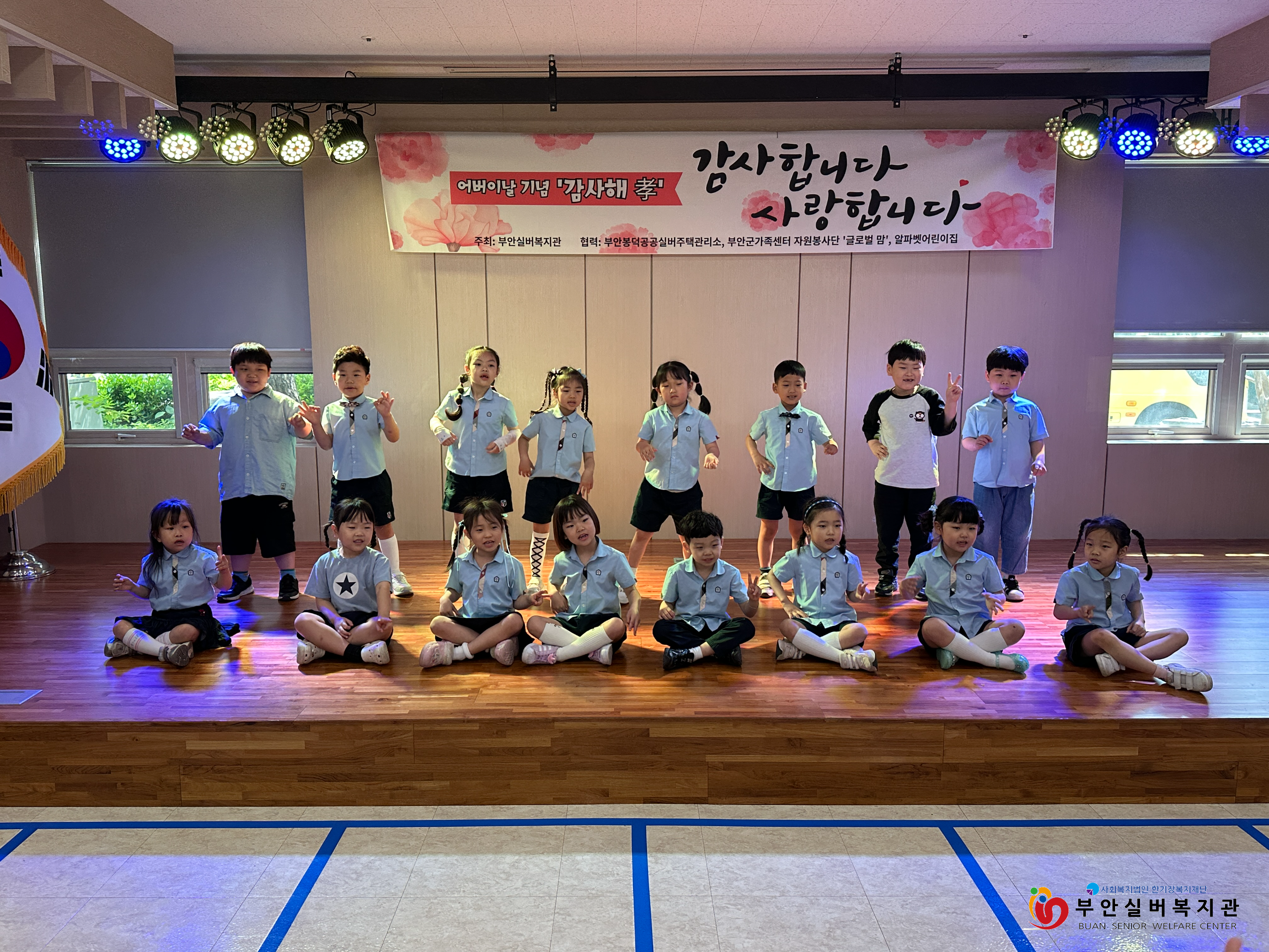 알파벳어린이집 원아들은 국악 동요 공연을 준비해 큰 박수를 받았으며, 어르신들은 아이들의 정성에 감동해 따뜻한 격려를 전했습니다. 공연 후에는 부안실버복지관 ‘마을지킴이’ 선배시민자원봉사단이 어린이날을 맞아 아이들에게 작은 선물을 전달해 훈훈함을 더했습니;다.