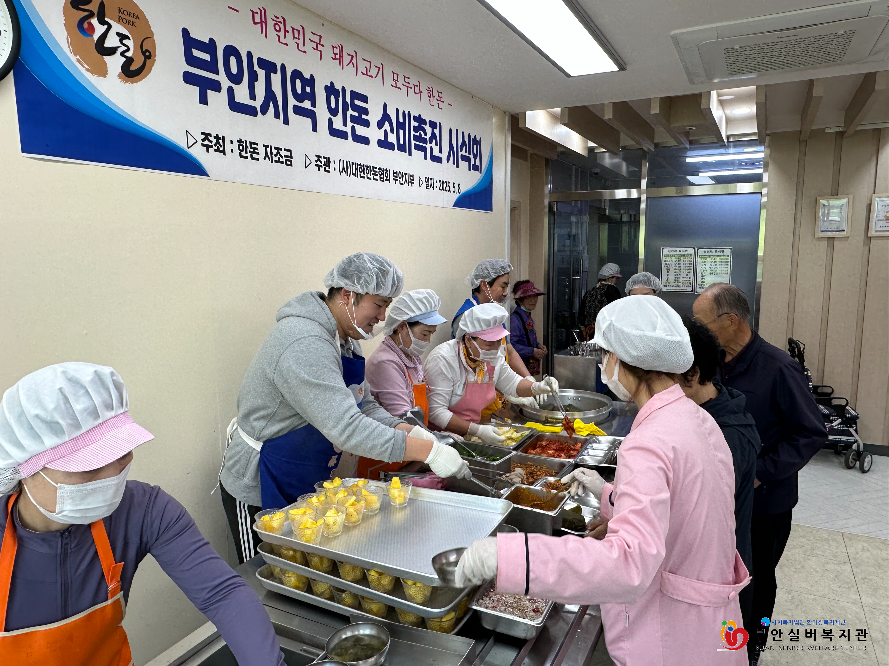 또한, (사)대한한돈협회 부안지부(지부장 박용석)는 돼지고기 200kg을 후원해 행사에 참석한 어르신들을 위한 풍성한 식탁을 마련했습니다. 박용석 지부장을 비롯한 임직원들은 직접 음식을 준비하고 대접하며 어르신들의 건강을 기원했습니다.