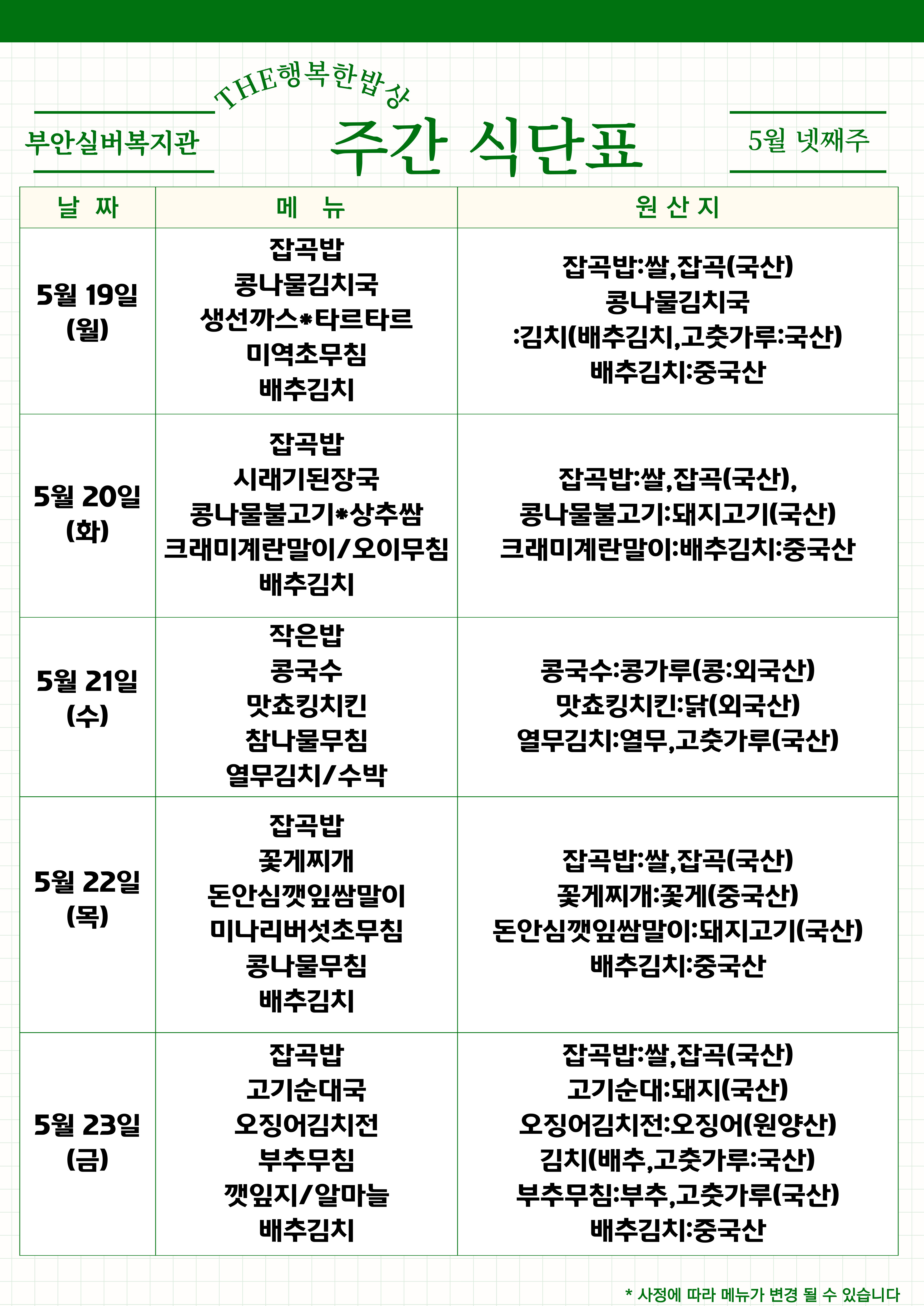 복지관 식단표 - 5월 2주  (0) 2025.05.09