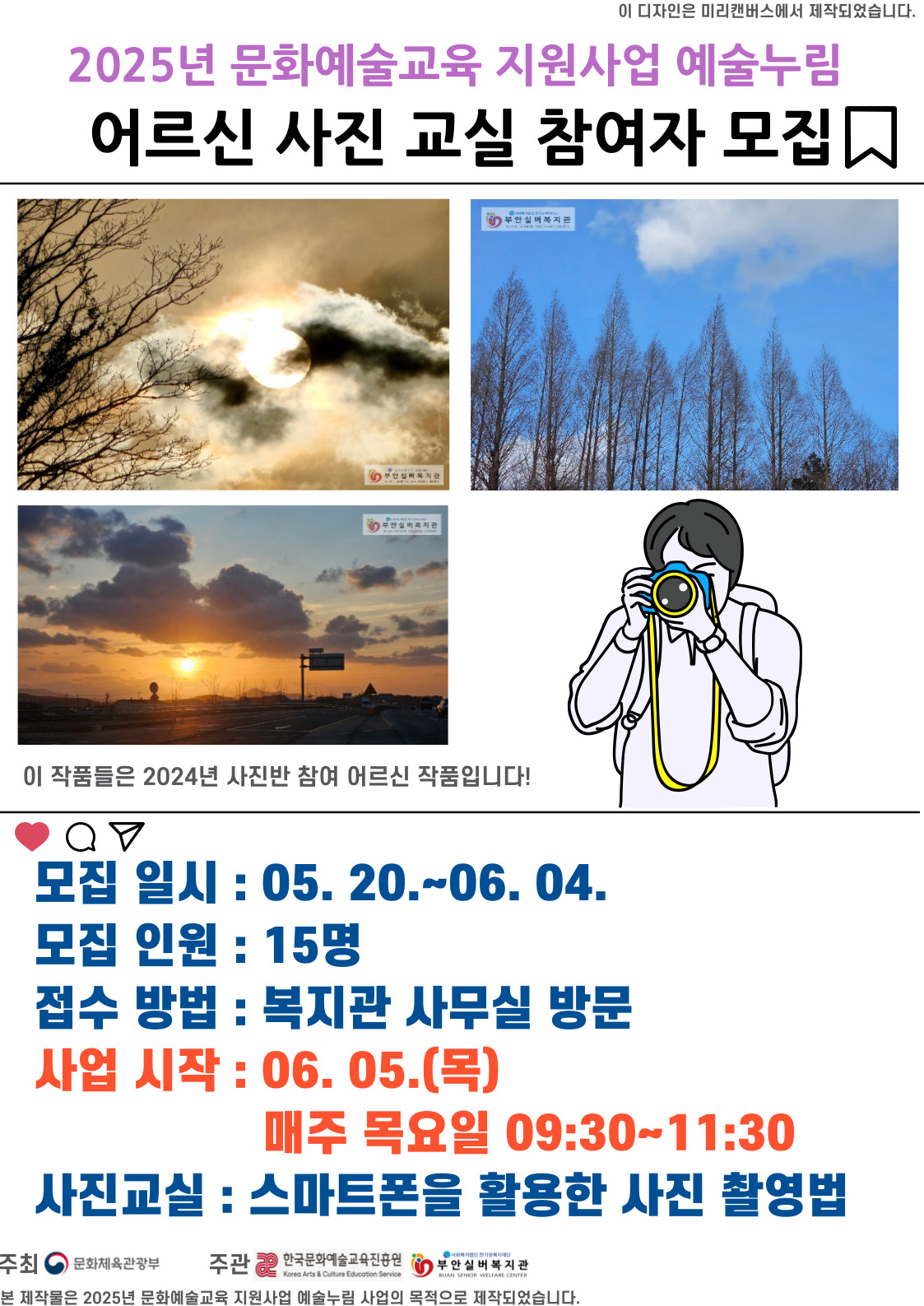 부안실버복지관에서는 2025년 문화예술교육 지원사업 <예술누림>에 선정되어, 어르신들을 위한 사진교실을 진행합니다.