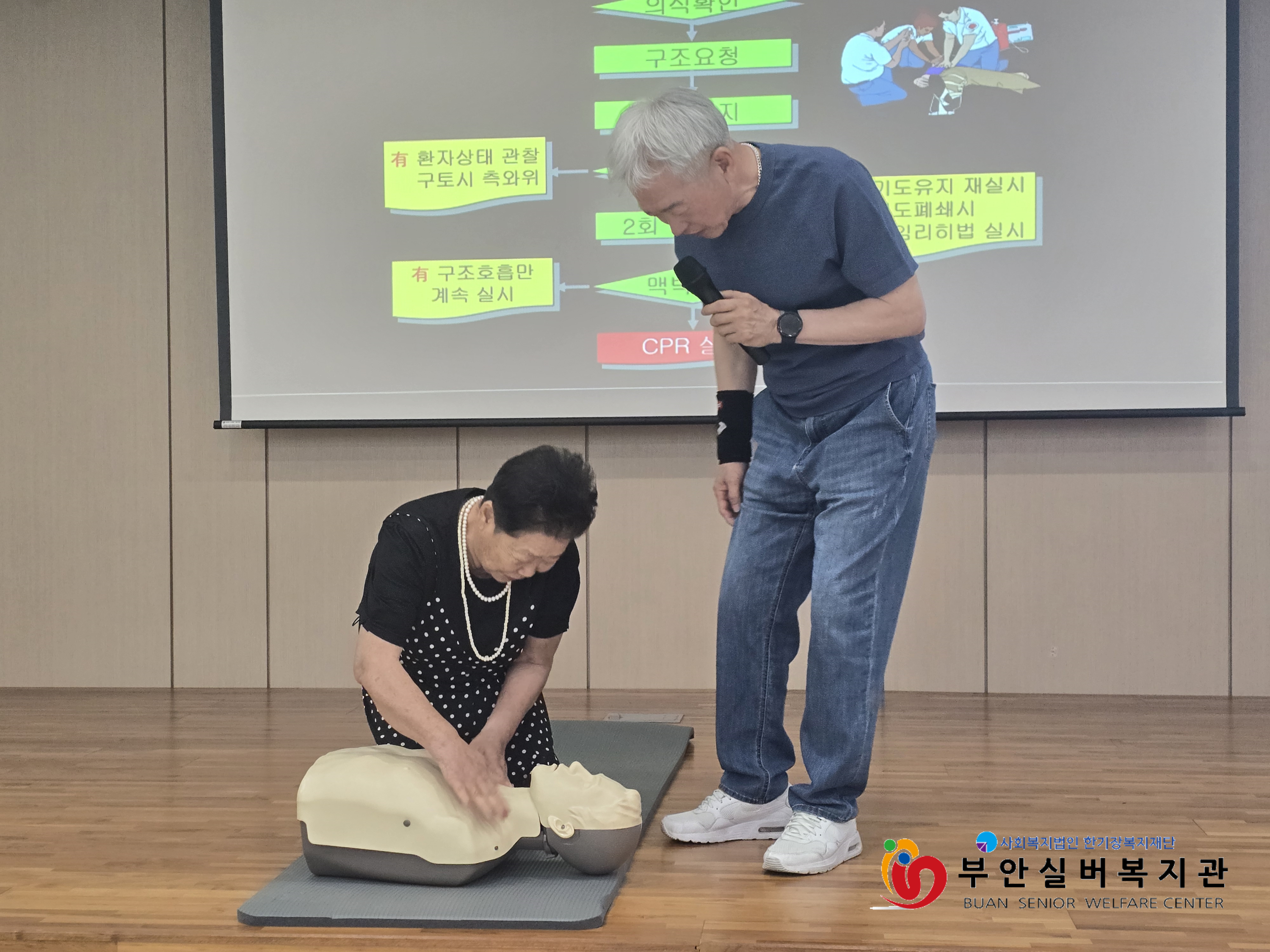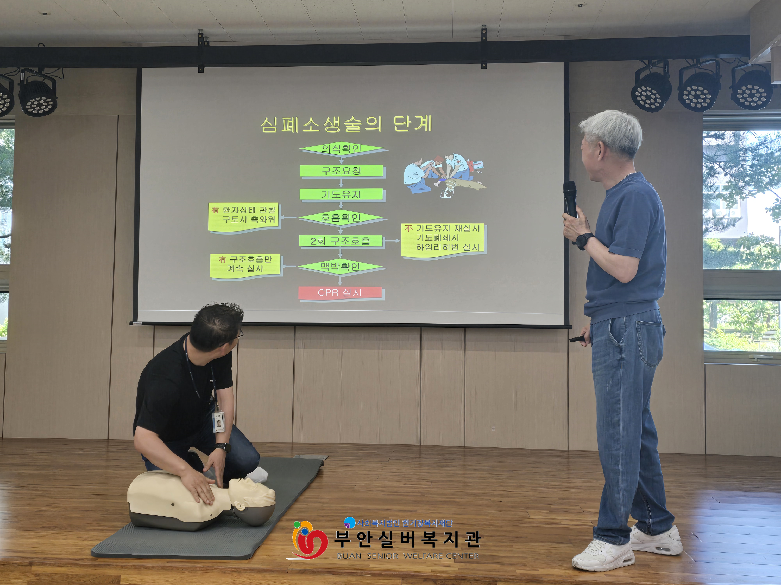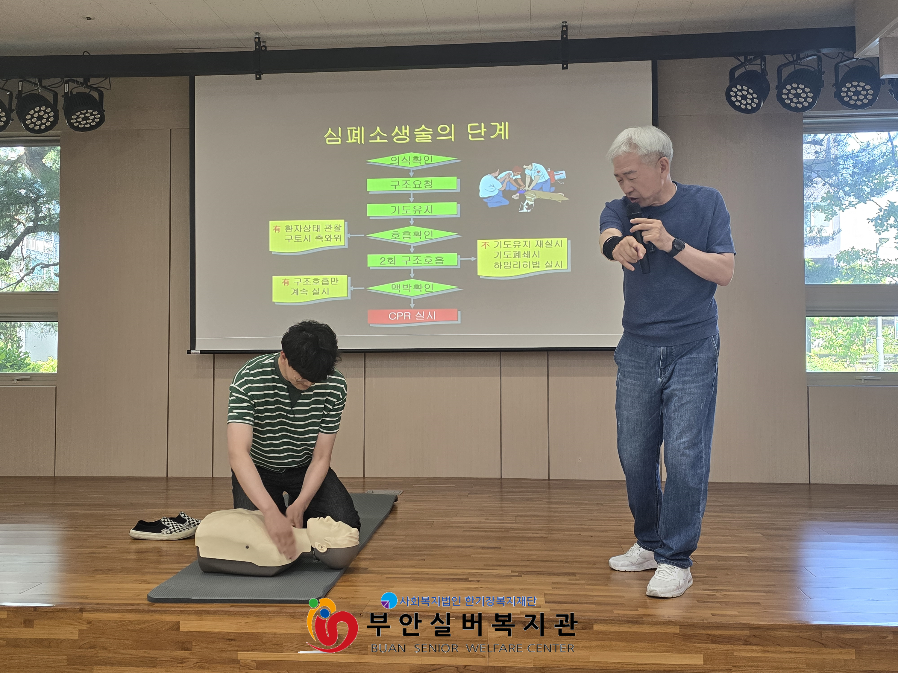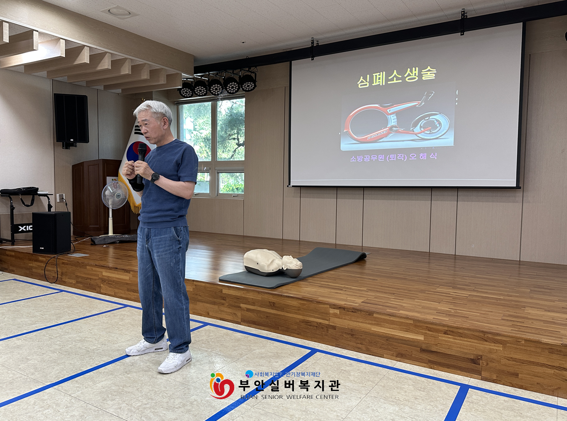 부안실버복지관에서는 전직 소방공무원이자 안전교육 전문 강사인 오해식 강사님과 함께 심폐소생술(CPR) 이론 및 실습 교육을 진행하였습니다.