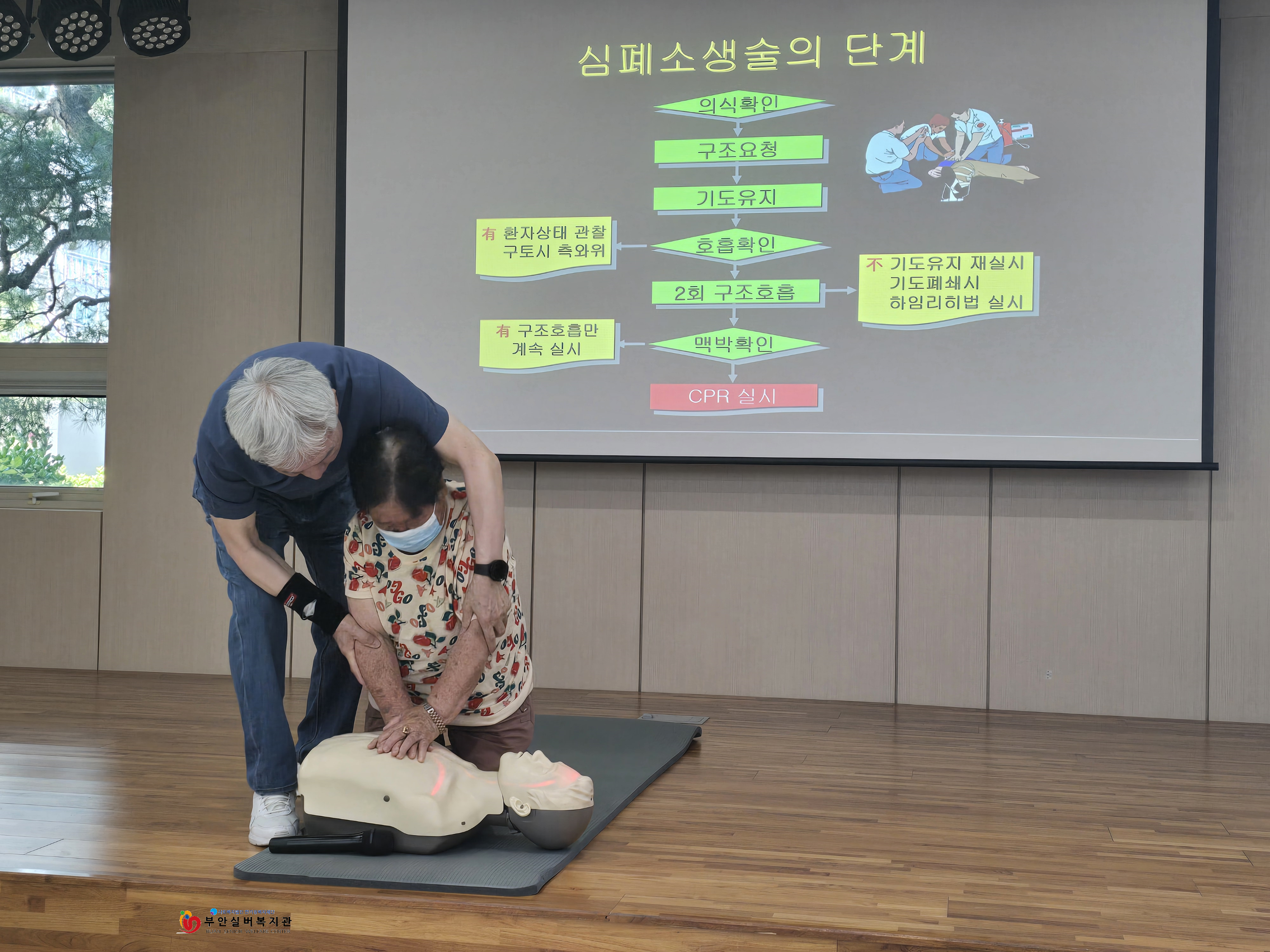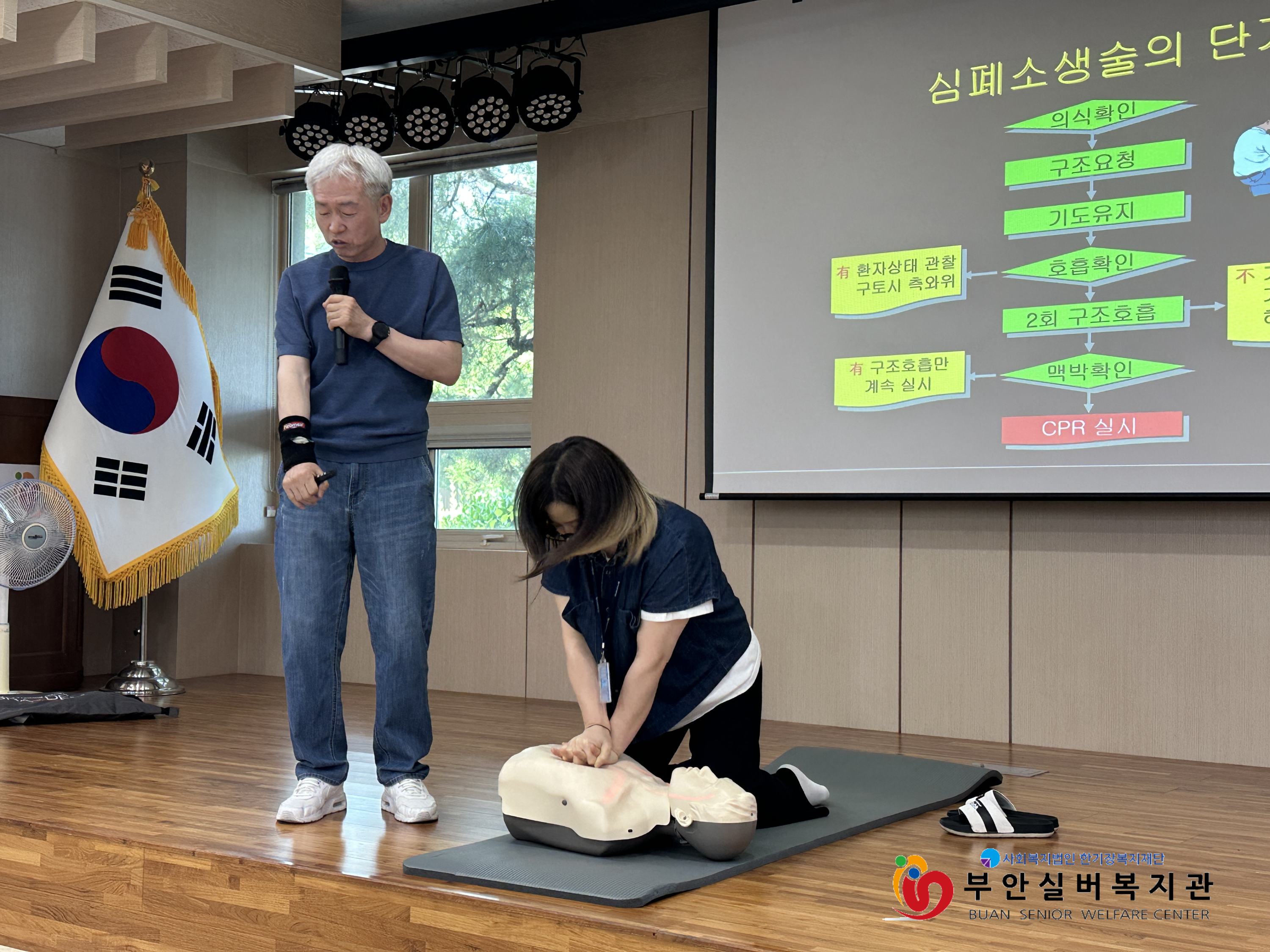 부안실버복지관에서는 전직 소방공무원이자 안전교육 전문 강사인 오해식 강사님과 함께 심폐소생술(CPR) 이론 및 실습 교육을 진행하였습니다.