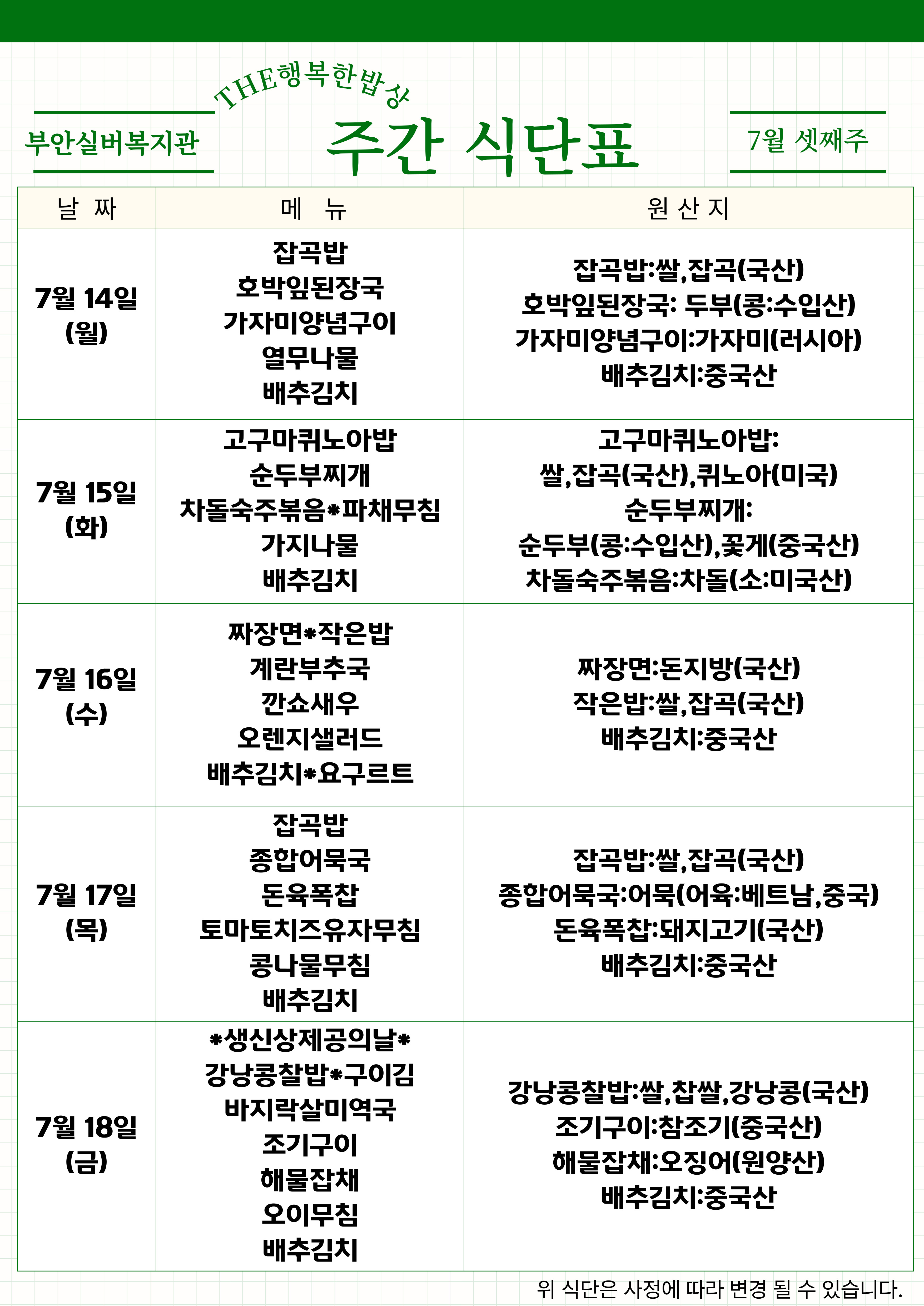 | 복지관 식단표 - 7월 2주 (0) | 2025.07.04 |