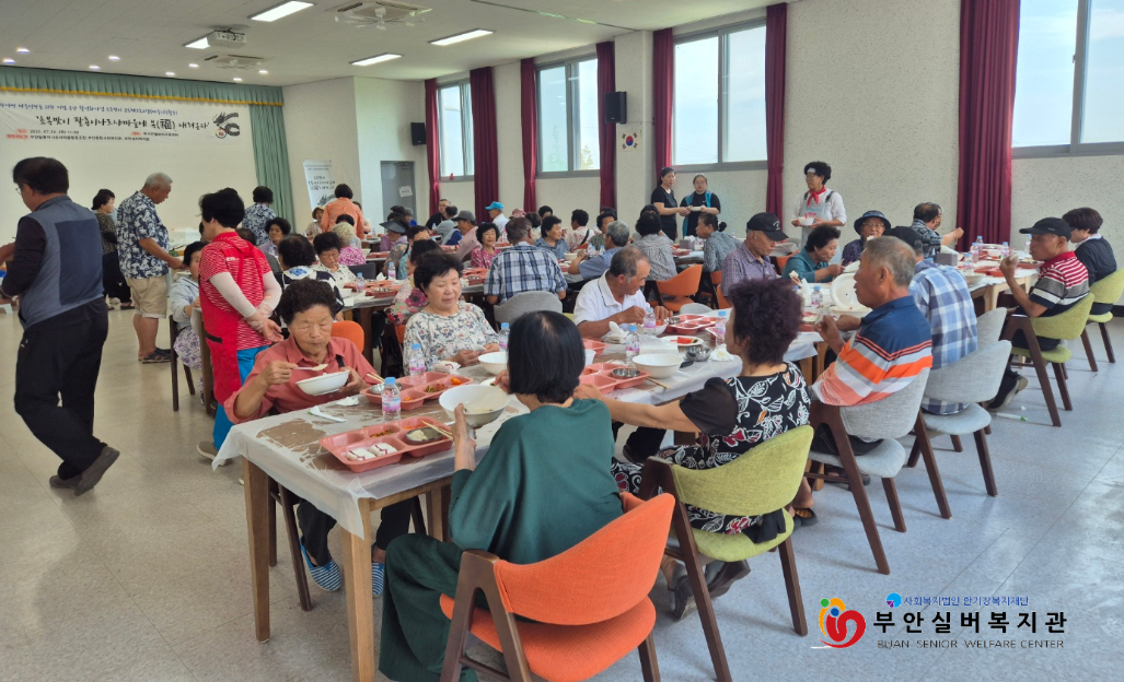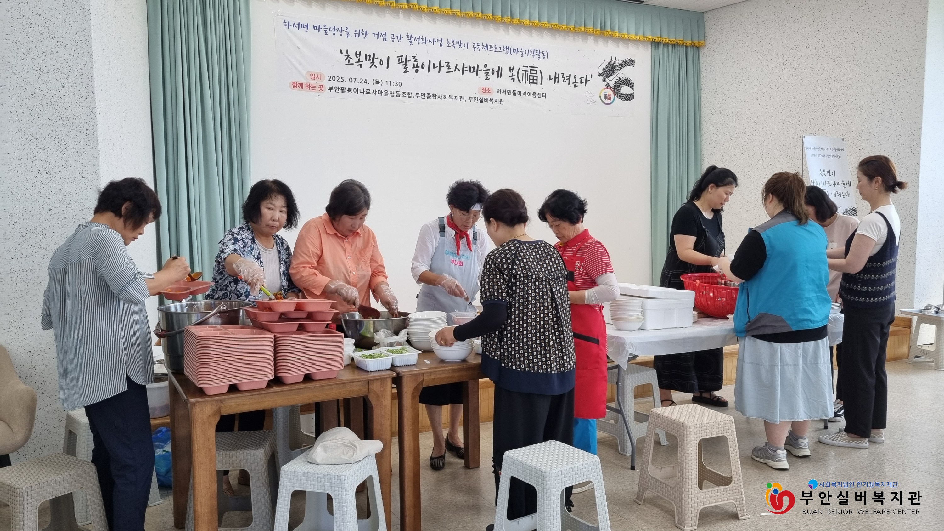부안실버복지관과 부안종합사회복지관은 지난 24일 부안군 하서면 돌마리이음센터에서 팔룡이나르샤마을 주민들을 모시고 복달임 음식을 나누며 서로의 건강을 기원하는 뜻깊은 행사를 진행했습니다. 팔룡이나르샤마을은 하서면 석상리 8개 마을(구암, 마전, 반암, 석상, 석하, 용와, 운암, 청일)이 속한 단체로 석상리 마을 주민들의 단합과 마을공동체성을 높이기 위해 만들어졌습니다.