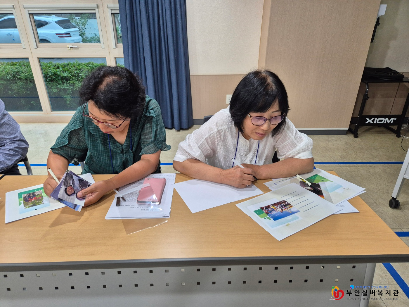 '죽음준비를 위한 웰다잉'에 대한 교육을 싸나톨로지협회 손주완 교수님에게 들었습니다. 삶을 돌아보는 과정 속에서 삶에 대한 성찰을 해야 한다 하였지만 너무 어려웠습니다. 옛날 사진을 정리하며 기억에 남는 몇 장을 가져와 '자서전'을 만들었습니다. 좋은 기억이 담긴 사진이었지만 후회되고 고생한 기억도 같이 떠 올라 눈물을 흘리기도 하였습니다. 지금까지 앞만보고 달려왔지 삶을 뒤돌아 본적은 거의 없었습니다. 남은 삶을 어찌 살아야 할 지 많은 생각이 든다고 하십니다. 참여하신 모든 분들이 자신의 삶에 대한 성찰을 충분히 잘 하고 있다는 생각이 들었습니다.