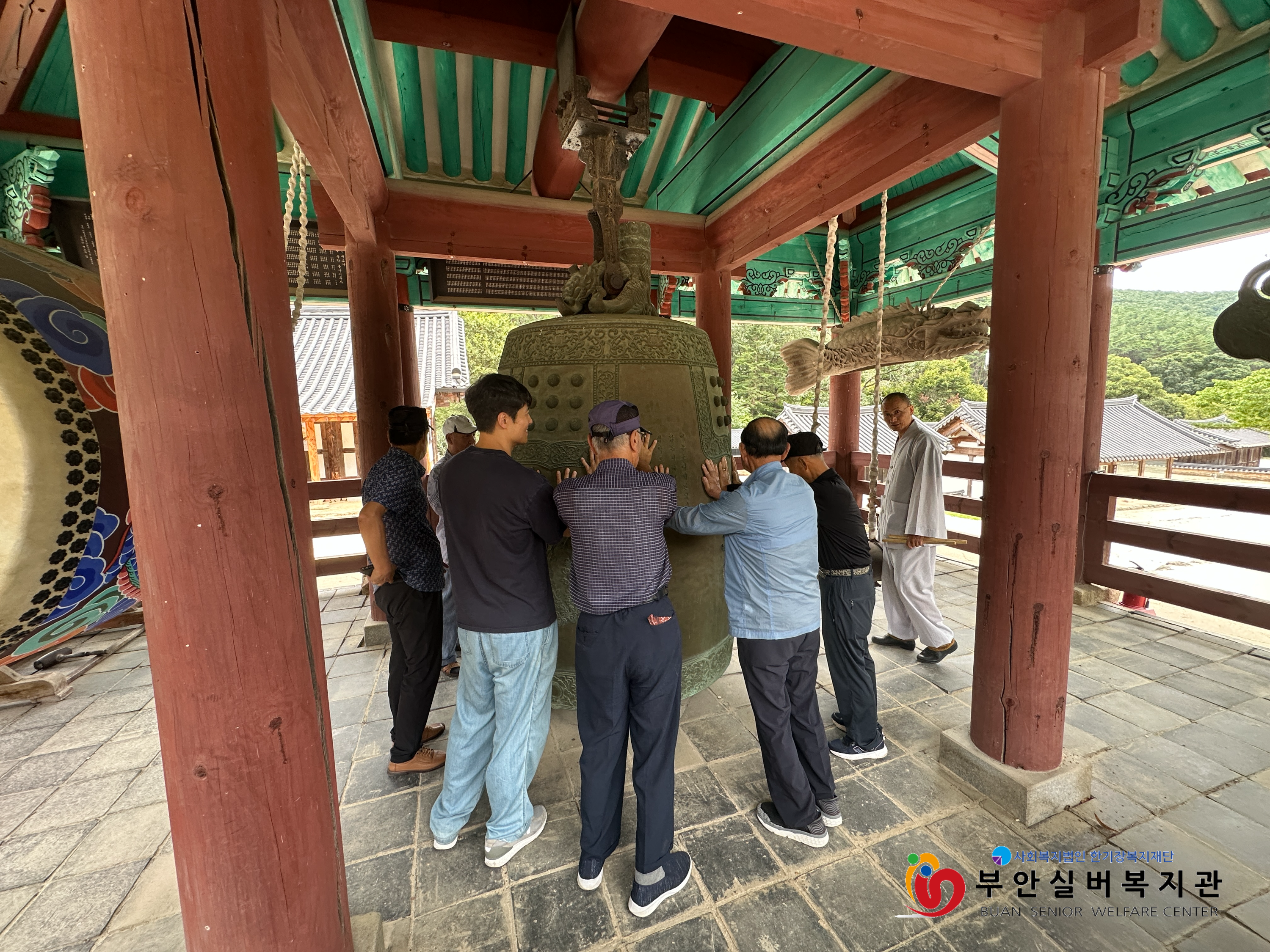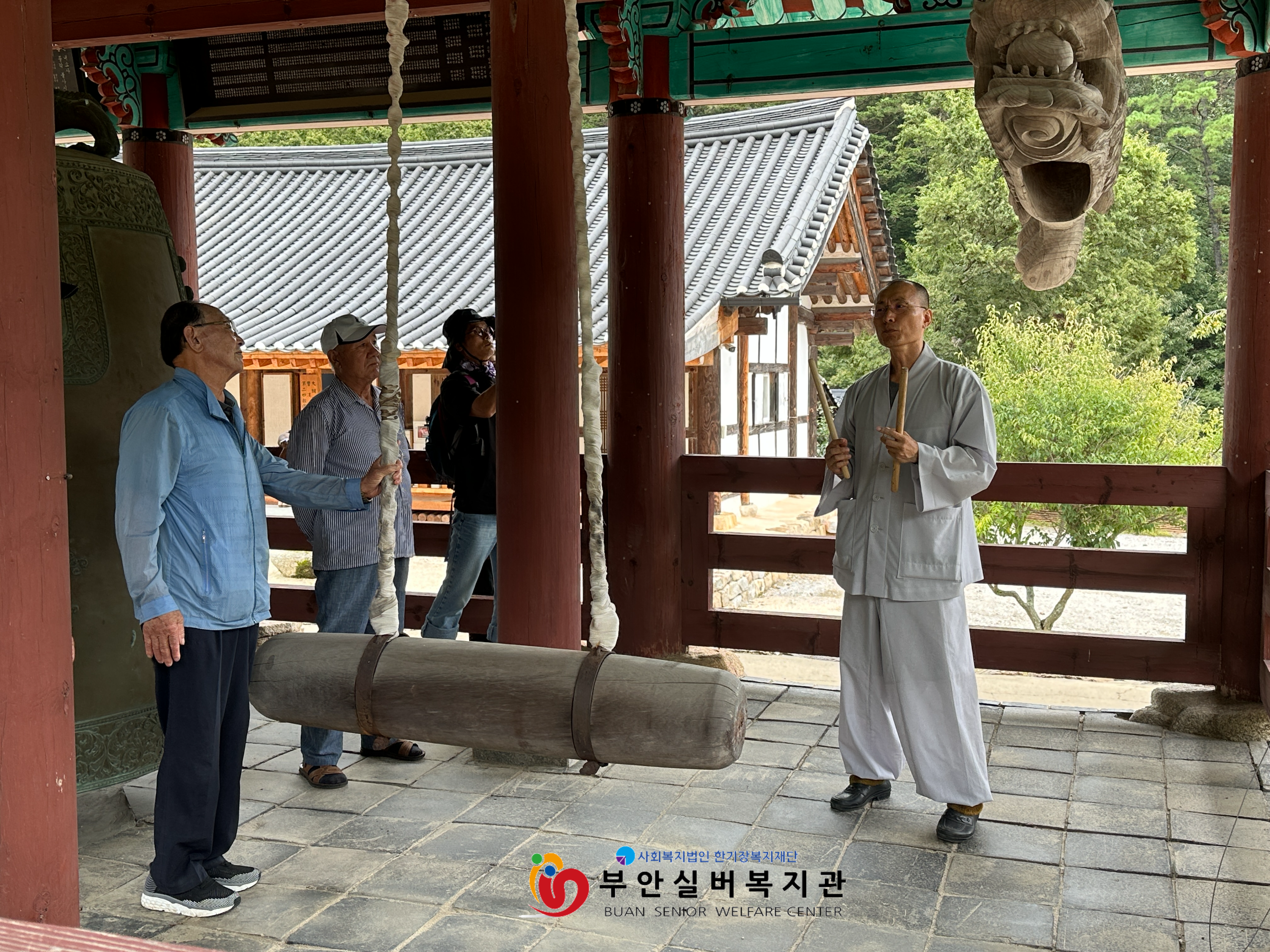 9월 15일은 그동안의 활동을 지지하고 격려하기 위해 내소사 나눔 템플스테이를 진행했습니다. 내소사에 도착하니 진각 스님께서 어르신들을 반갑게 맞이해 주셨습니다. 스님께서 내소사 라운딩을 하며 절의 역사와 전해져 내려오는 전설을 설명 해 주셨습니다.  처음 듣는 이야기에 어르신들도 귀기울이며 관심 있게 들으셨습니다. 내소사 범종 앞에서는 스님이 직접 범종을 쳐서 종소리를 들려주셨습니다. 범종의 웅장한 소리와 함께 손바닥을 범종에 대고 몸으로 소리를 느껴보라고 권하셨는데 어르신들 모두 흥미롭게 참여하셨습니다.  범종, 법고, 목어에 관한 이야기까지 들으며 어르신들은 절 문화를 이해하고 공감하는 시간을 가졌습니다.
