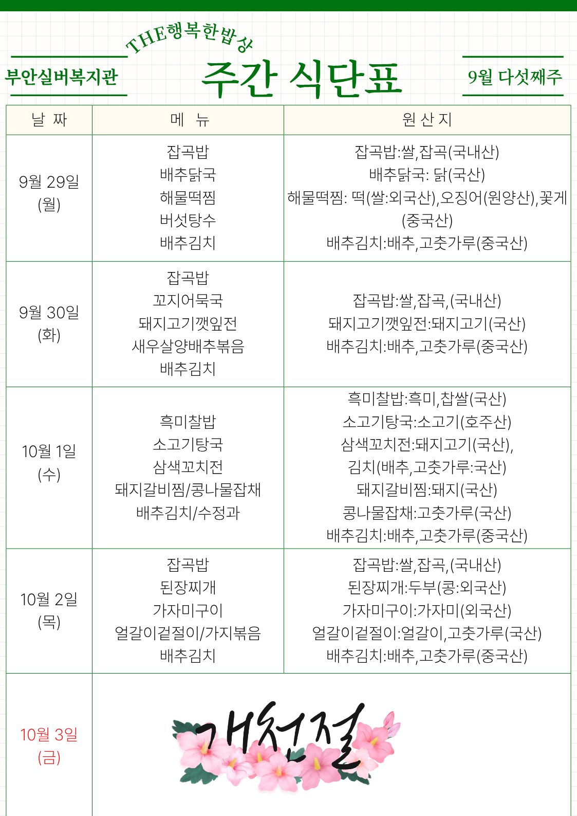 | 복지관 식단표 - 9월 3주 (0) | 2025.09.11 |