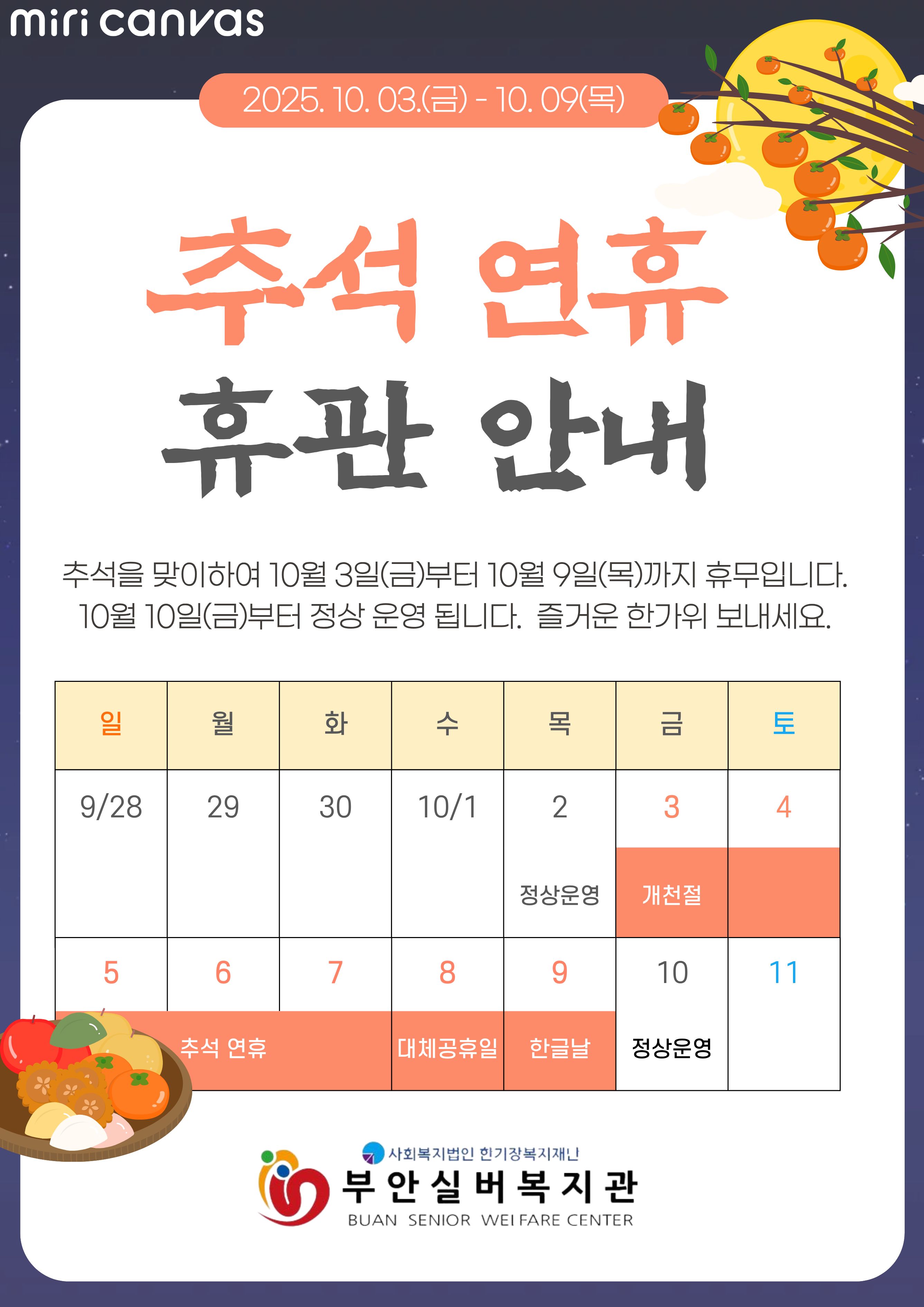 10월 3일부터 9일까지는 개천절, 추석연휴, 한글날로