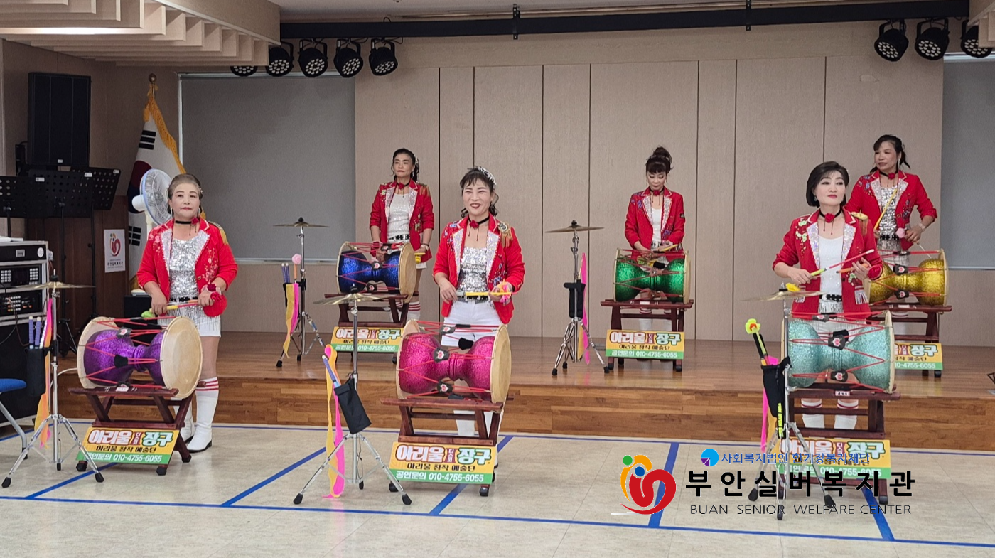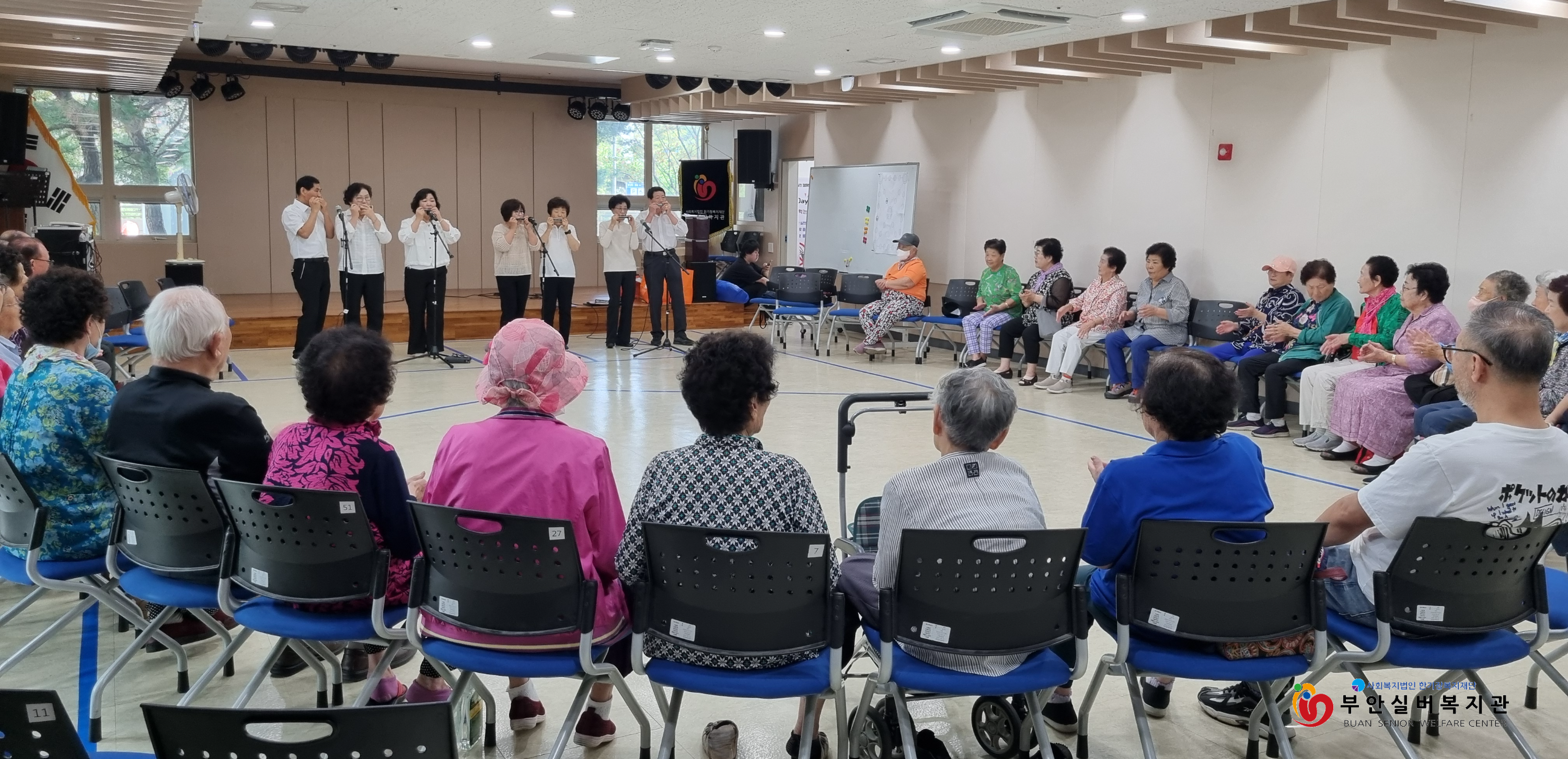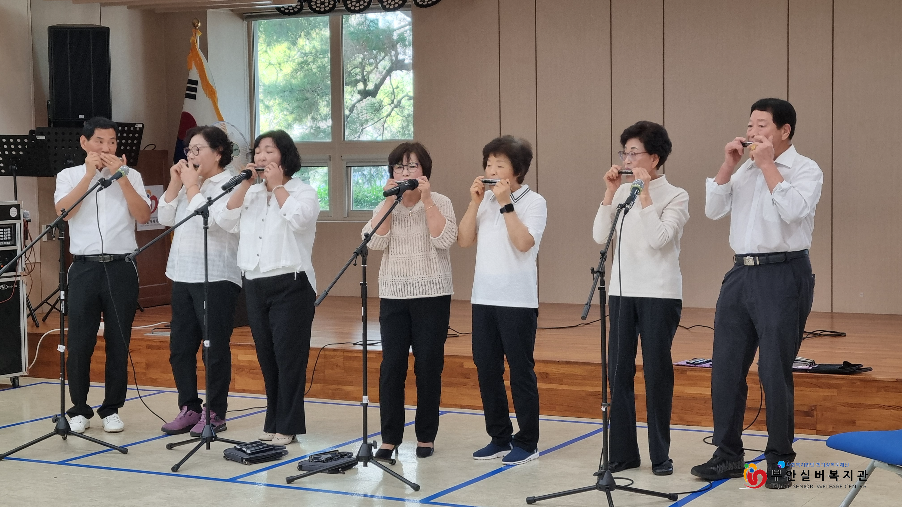 놀이마당에서는 윷놀이 등 전통 놀이를 통해 어르신들이 서로 응원하고 화합하는 시간을 가졌습니다. 행사를 축하하기 위해 하모니카공연단과 아리울창작예술단의 고고장구팀이 신나는 연주를 선보여 행사 분위기를 한층 돋웠습니다.