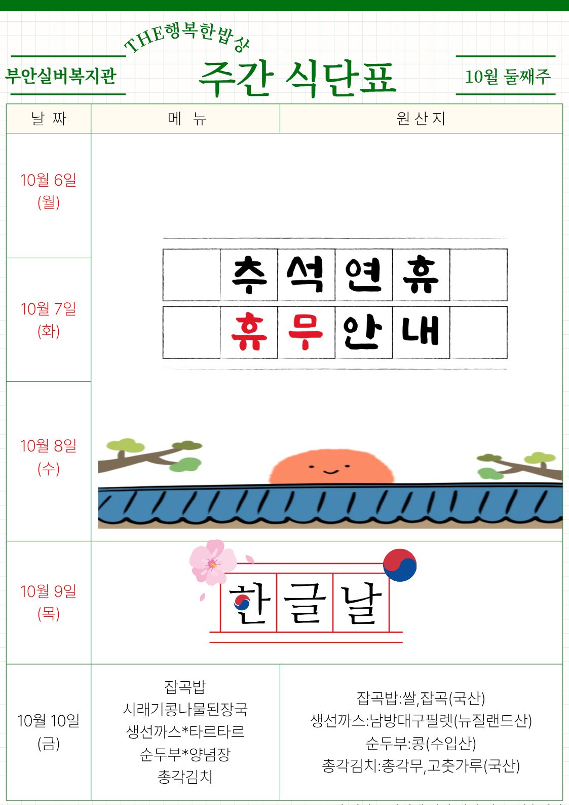 | 복지관 식단표 - 10월 3주 (0) | 2025.10.14 |