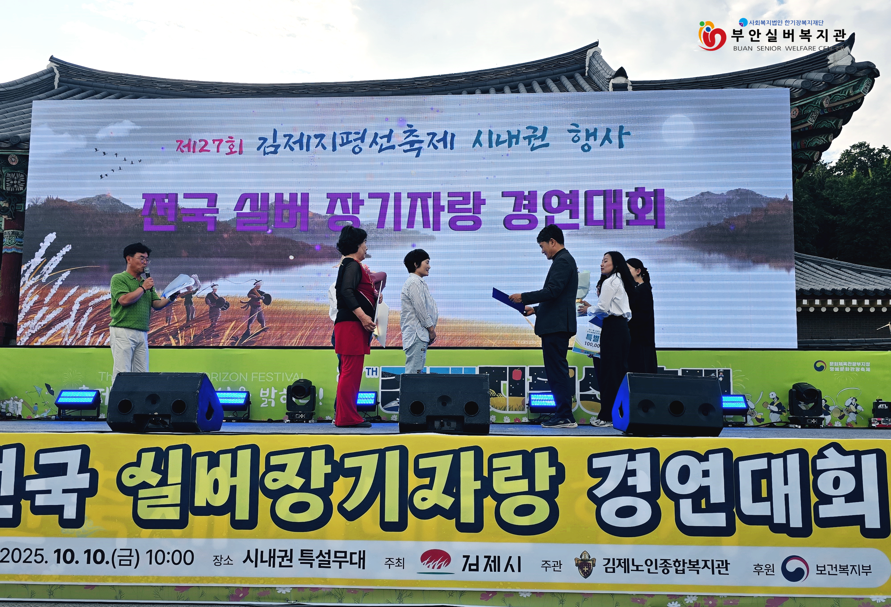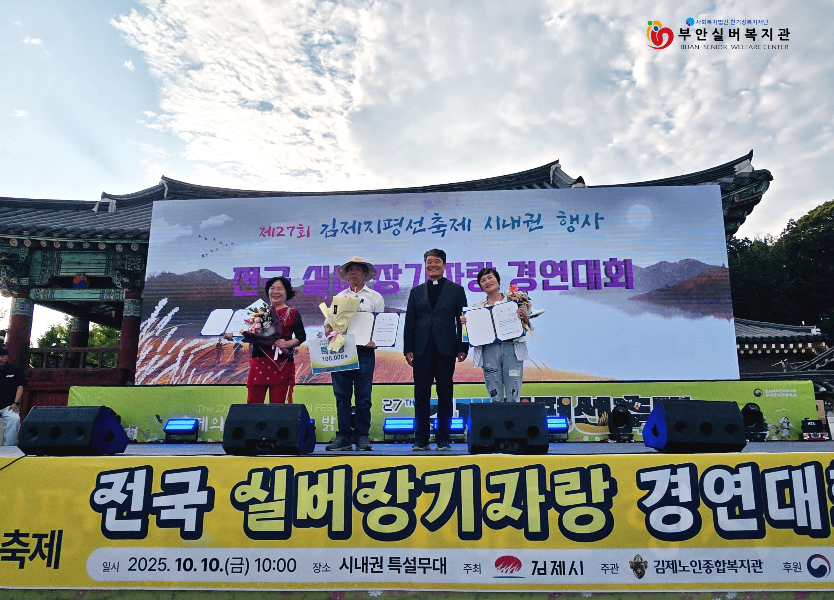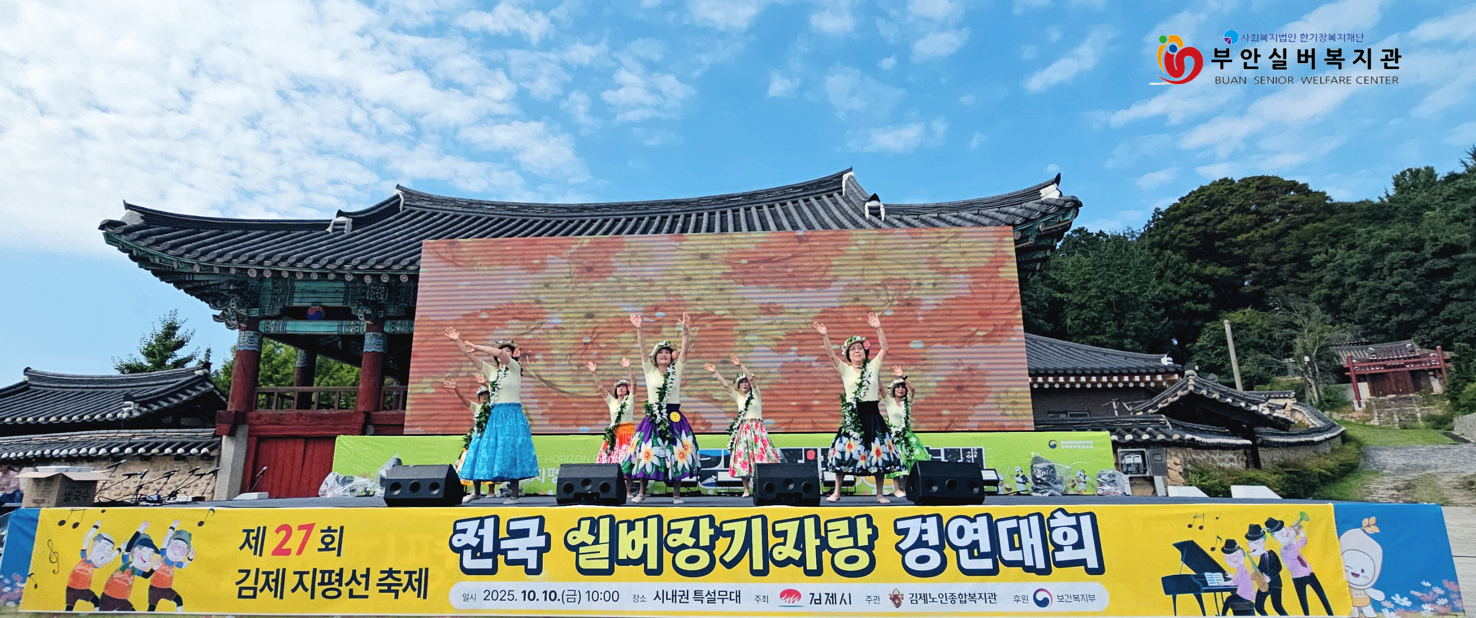 지난 10월 10일, 김제 향교 특설무대에서 열린 제27회 김제지평선축제 전국 실버장기자랑 경연대회에서 부안실버복지관 평생학습 훌라댄스반 어르신들이 ‘특별상’을 수상하는 쾌거를 이루셨습니다!