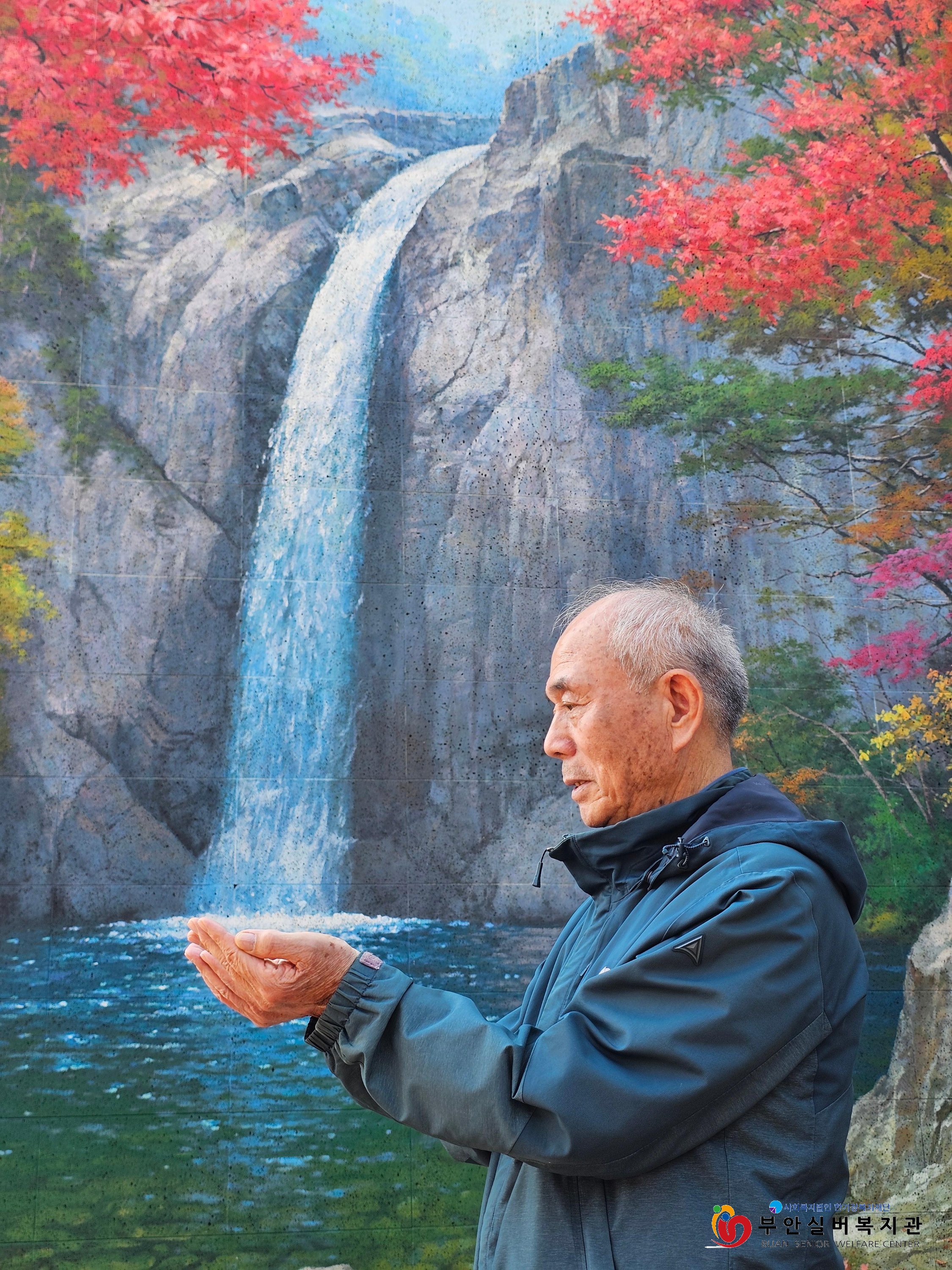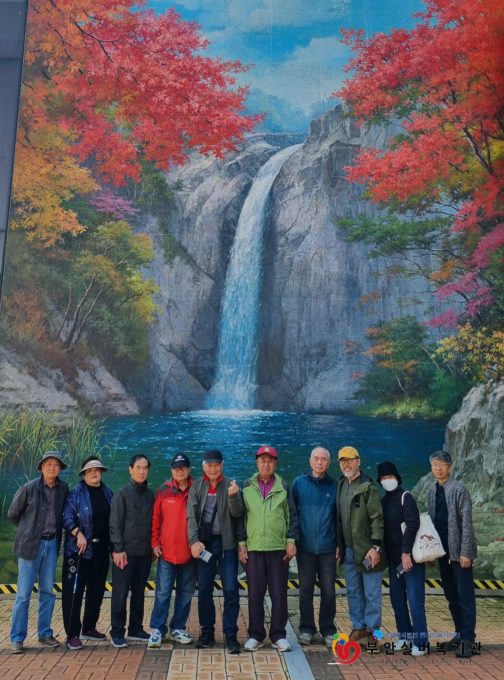 부안댐 물문화관에 도착하니 문화관 외벽에 그려진 직소폭포 사진이 눈에 들어옵니다. 어르신들은 사실감 있게 그려진 그림 앞에서 오랫동안 가 보지 못한 직소폭포에 온 것 같다며 좋아하셨습니다.