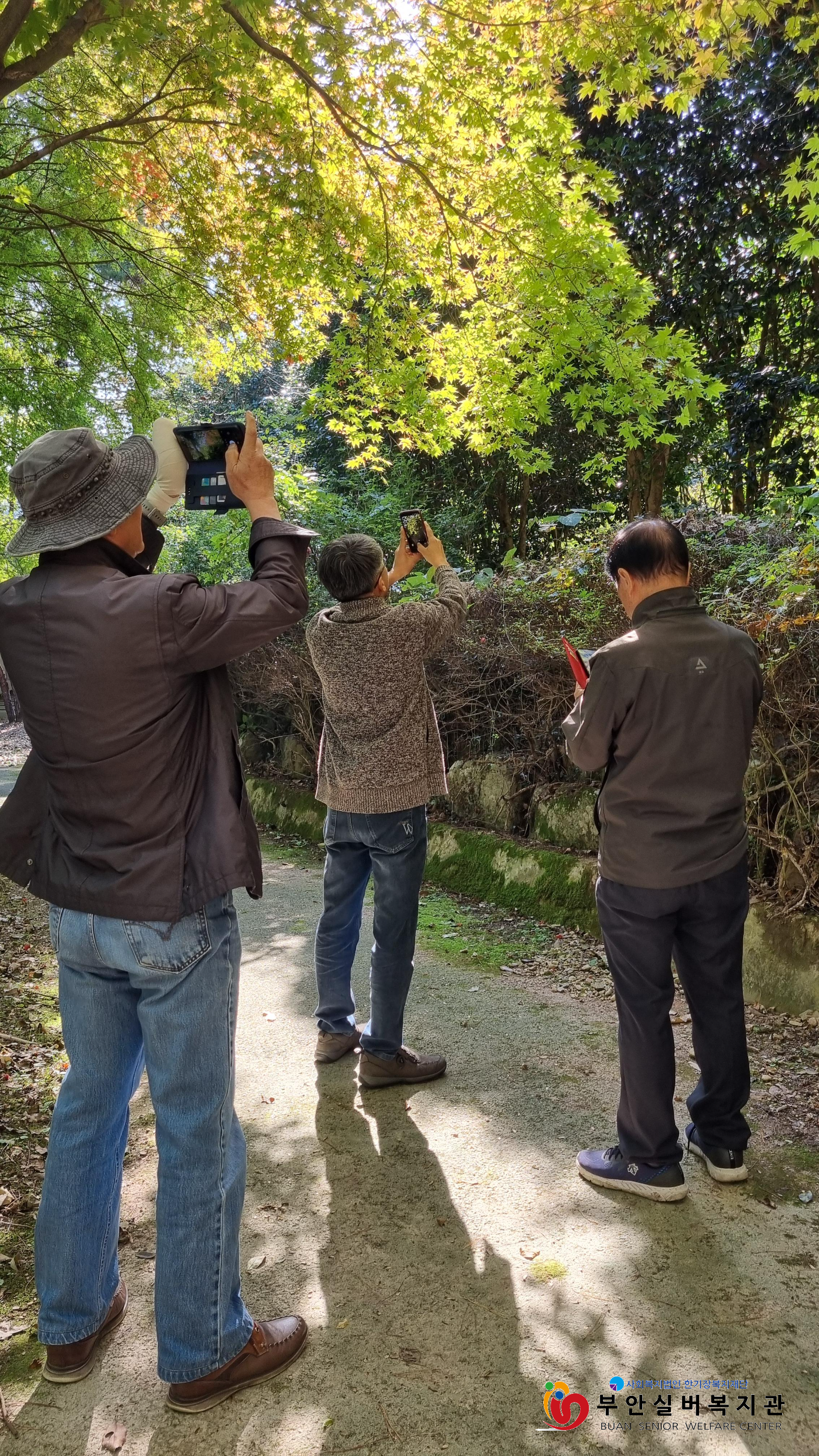 잎이 떨어진 길’, ‘노란 은행나무’, ‘햇살 받은 단풍나무’.... 각자의 시선으로 담은 사진들을 서로 보여주며 격려하는 모습이 다정합니다. 선선한 바람이 지날 때마다 나뭇잎이 우수수 떨어지는 부안댐 공원에서 어르신들은 사진을 찍으며, 담소를 나누며, 추억을 떠올리며 한참을 머물렀습니다.