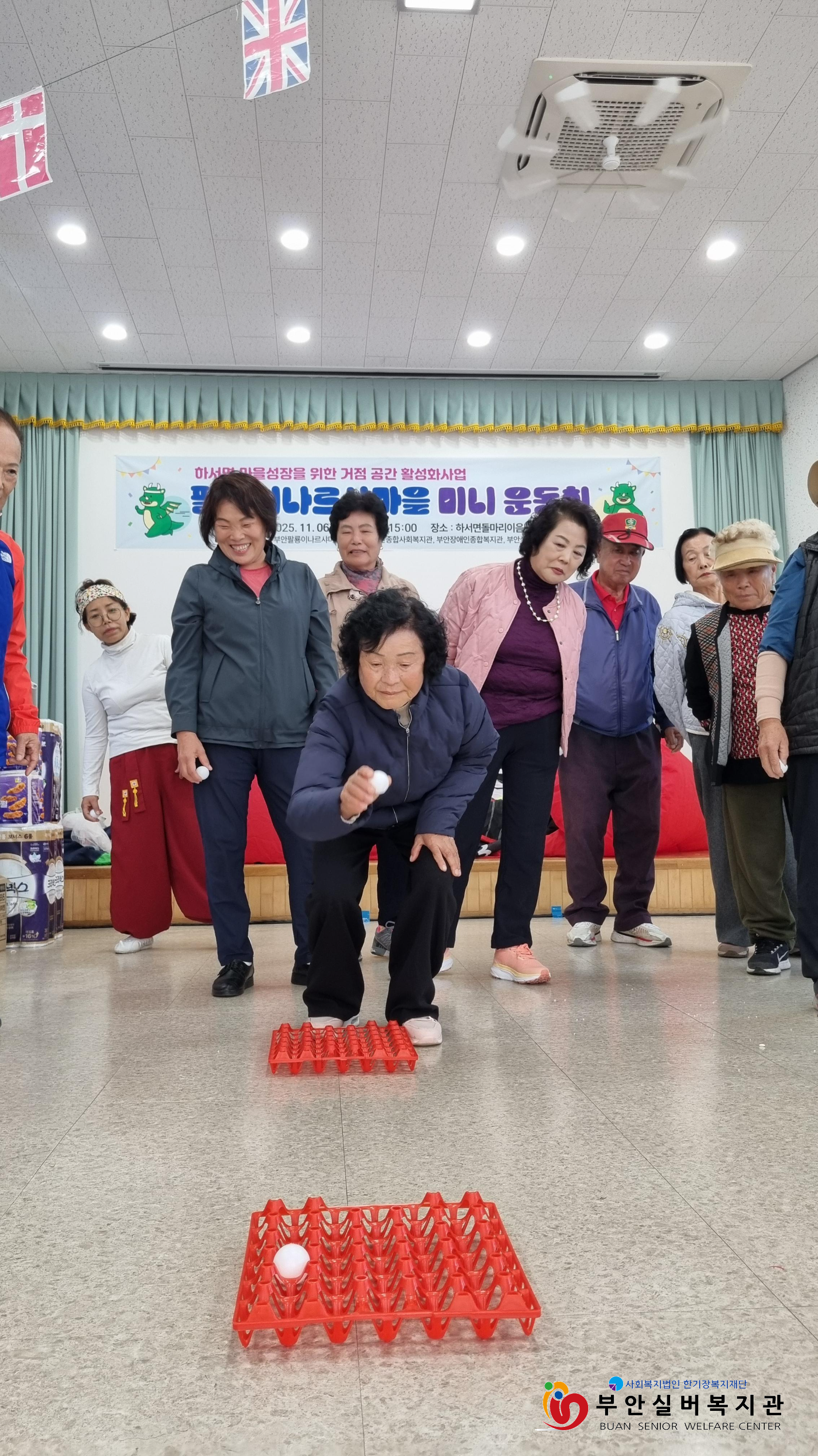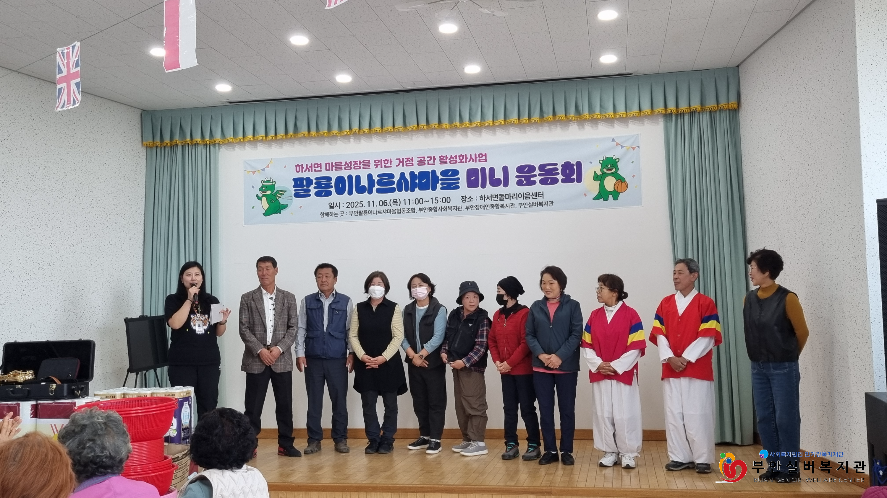 지난 116, 하서면 돌마리이음센터에 웃음과 따뜻함이 가득했습니다. 석상리 8개 마을 주민들이 한자리에 모여 ‘팔룡이나르샤마을 가을 미니운동회’를 즐겁게 개최했기 때문입니다이번 행사는 부안종합사회복지관과 부안실버복지관, 각 마을 이장님과 부녀회장님, 그리고 팔룡이나르샤마을협동조합 위원님들이 함께 머리를 맞대고 기획한 모두의 마을잔치였습니다.