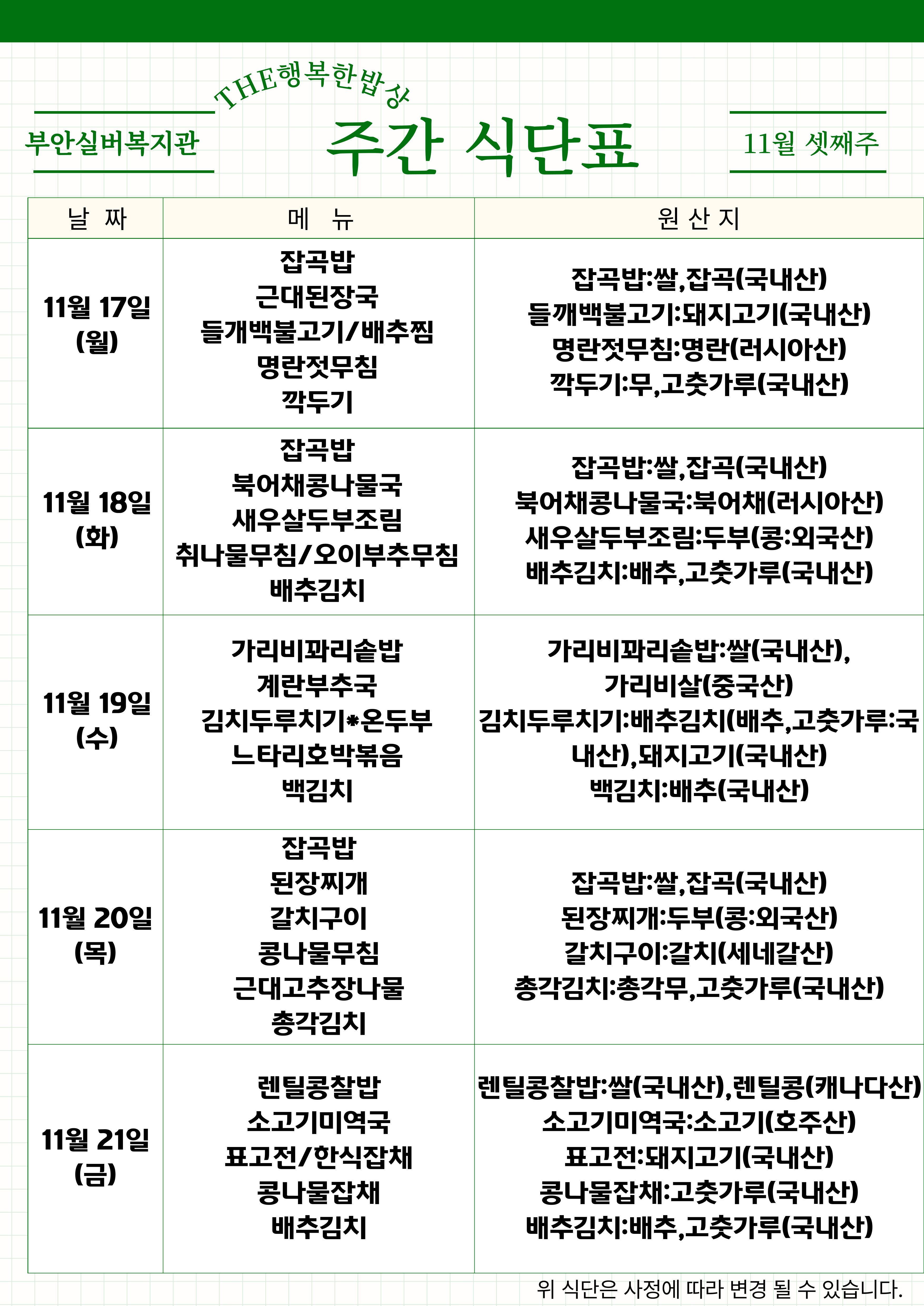 | 복지관 식단표 - 11월 2주 (0) | 2025.11.12 |