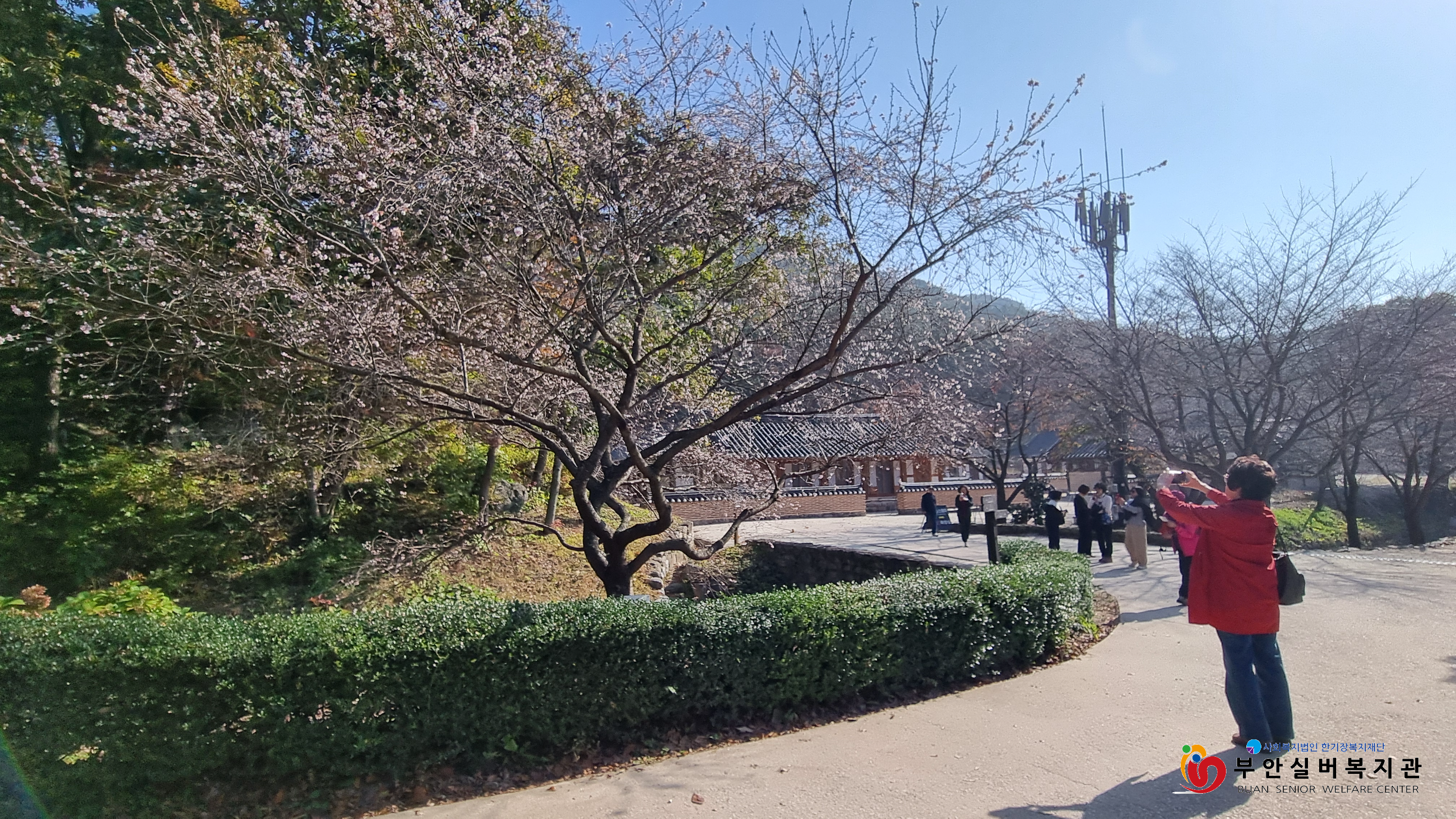 절 한편에 봄, 가을 일 년에 두 번 핀다는 ‘춘추벚꽃’이 사람들의 시선을 한 몸에 받고 있습니다. 가을에 피는 벚꽃이 있다는 것을, 그 꽃이 내소사에 있다는 것을 많은 어르신이 모르고 계셨습니다. 모처럼 찾은 내소사에서 뜻밖의 꽃을 구경하는 재미가 더해져 더욱 의미 있는 시간이 되었습니다.