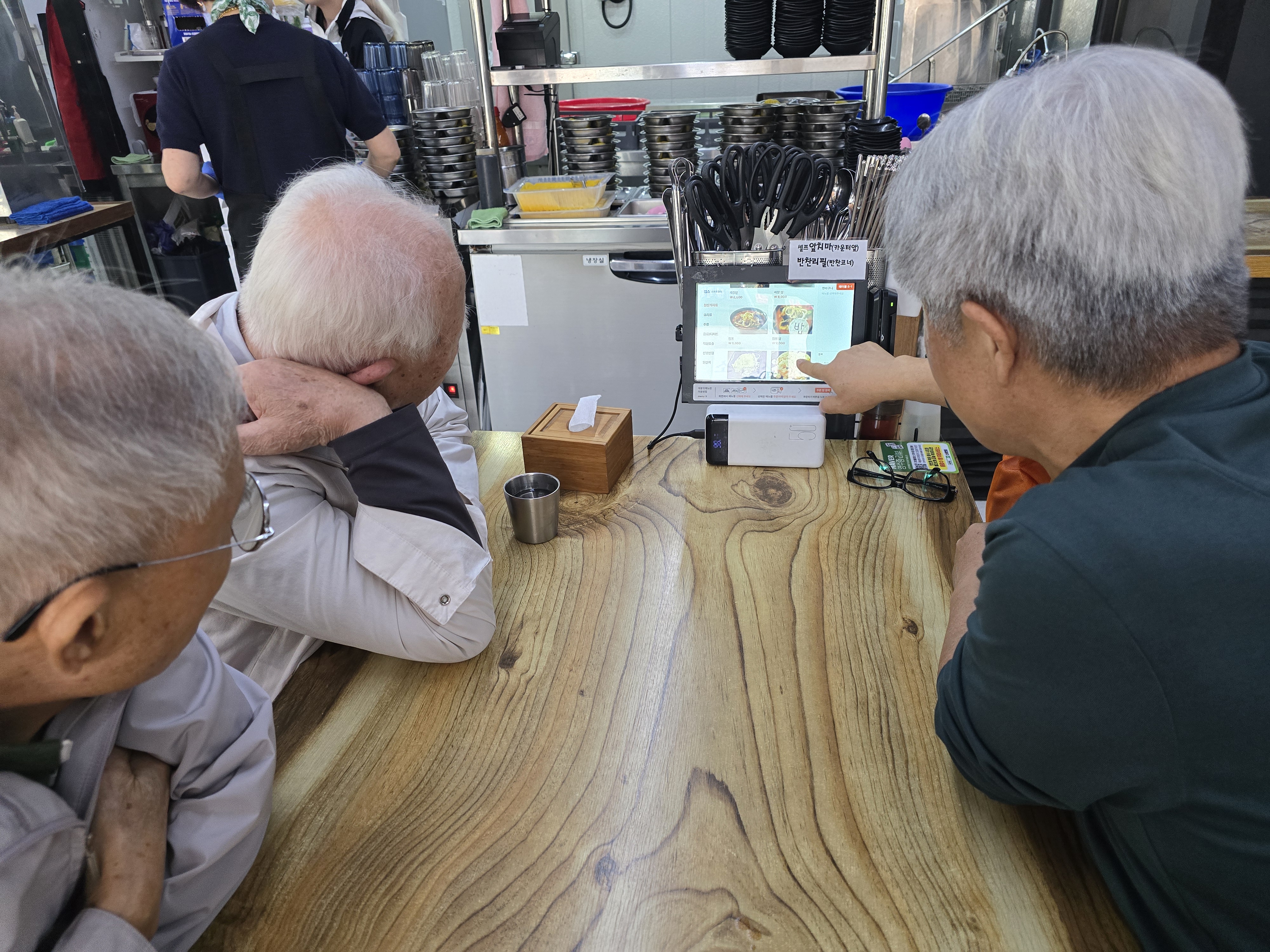 처음 방문한 곳은 복지관 앞 중화요리집이었습니다. 예전에는 카운터에서 주문받고 바로 음식이 나왔지만, 요즘은 테이블 마다 키오스크가 설치되어 어르신의 발걸음을 막고 있었습니다. 키오스크 중 제일 쉬운 키오스크라며 어르신들을 안심시키고, 중화요리집에 방문했습니다.