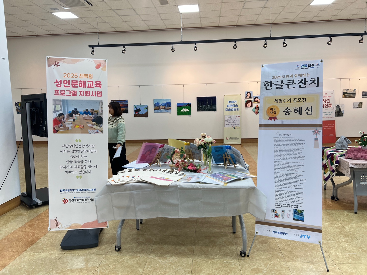 발표회가 시작 되기 전 1년 동안 활동한 모습과 작품을 전시한 전시회도 큰 인기를 모았습니다. 부안실버복지관 어르신 사진 엽서, 포스터, 한글 시화, 공예(뜨개질)과 부안복지관 참여자의 한글 이야기, 사진, 서예 작품, 미술 작품, 디지털 배움터의 AI 학습 영상은 감동과 즐거움을 더 했습니다.