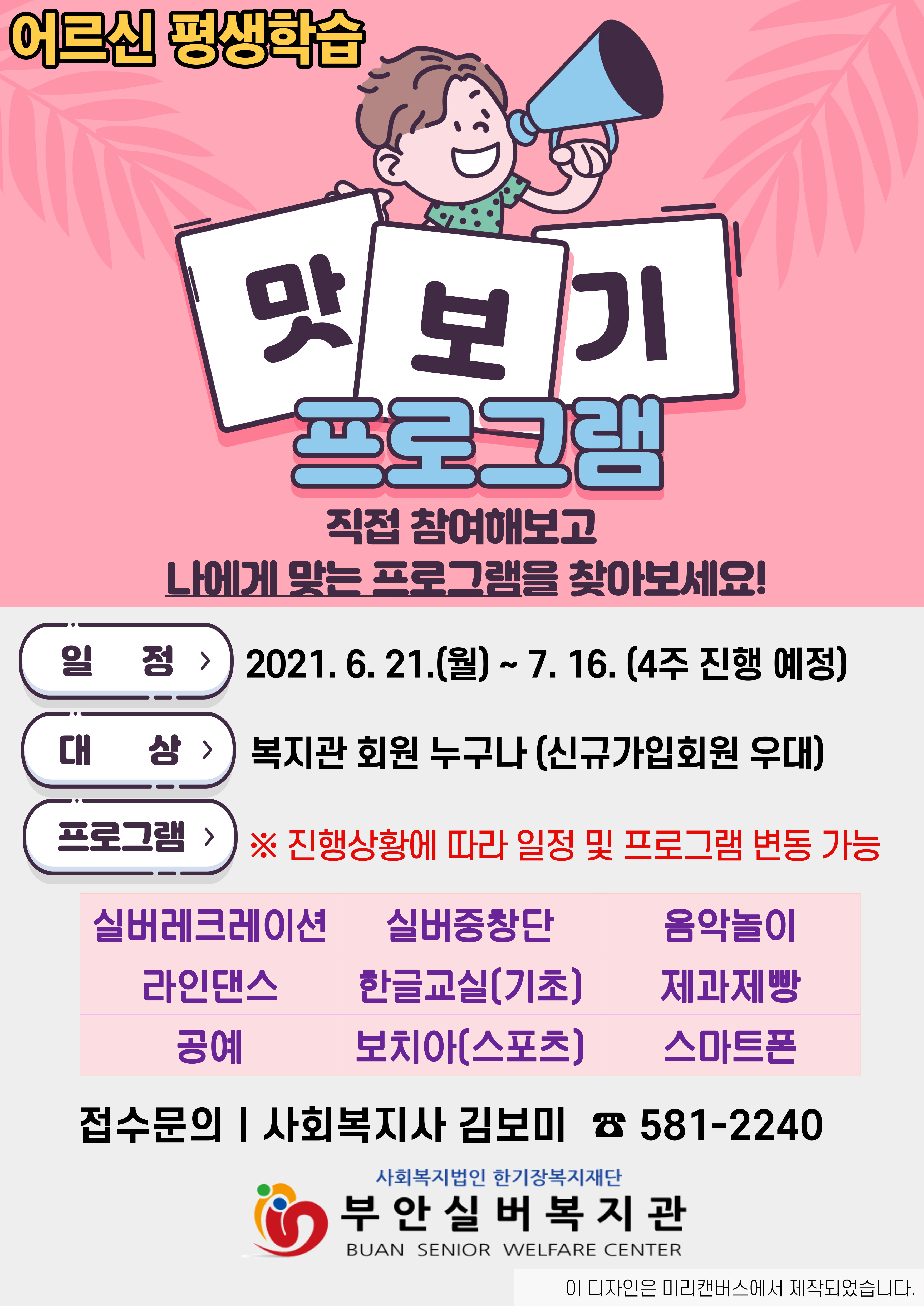 | 부안실버복지관 신규 이용자 모집 (0) | 2021.06.01 |