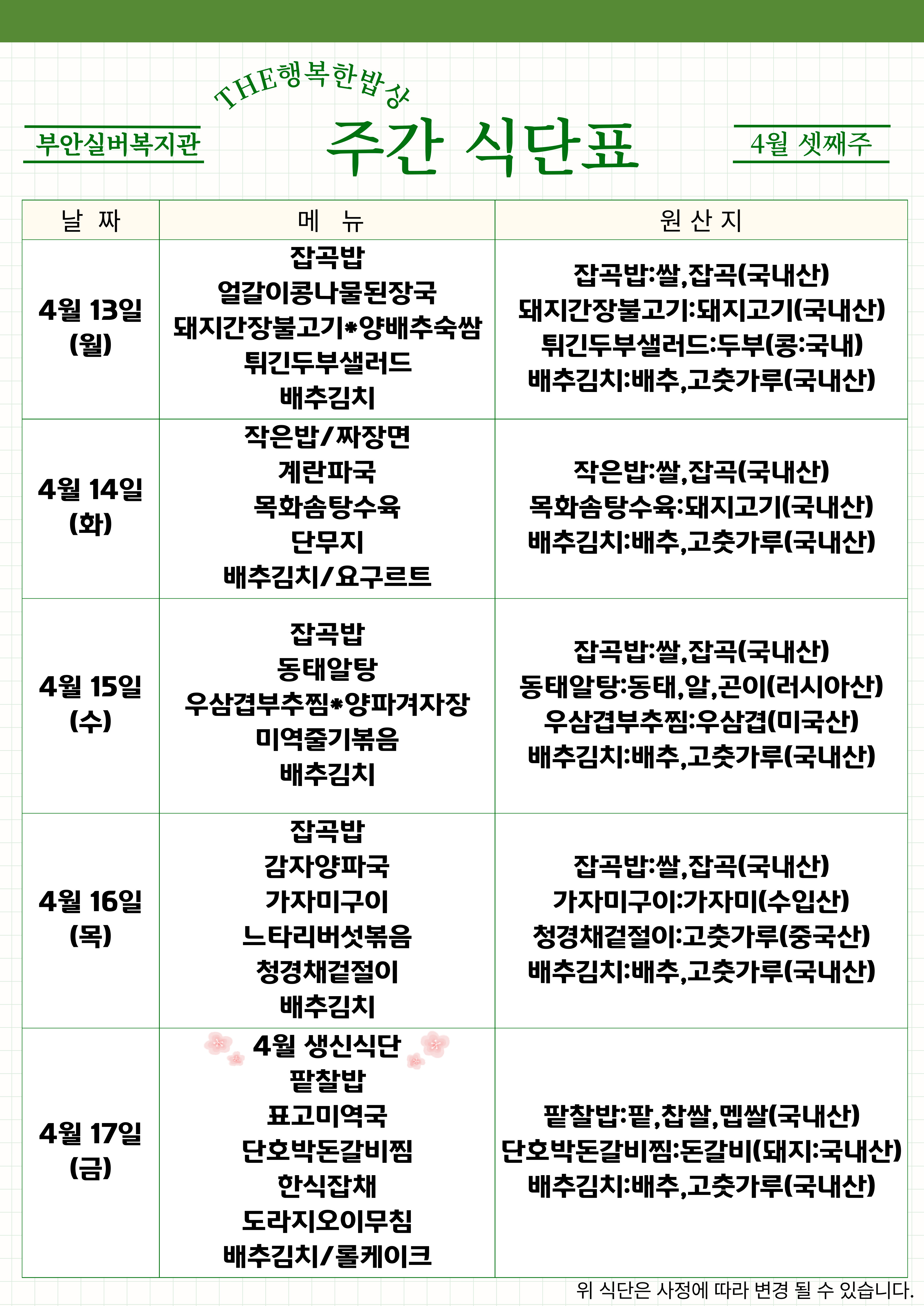 복지관 식단표 - 4월 2주  (0) 2026.04.06