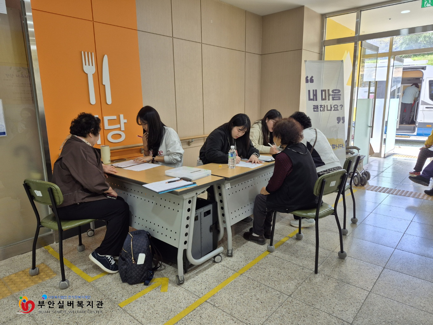 부안실버복지관에서는 지난 4월21일 이용 어르신을 45명을 대상으로 부안군정신건강복지센터와 함께 우울 및 스트레스 지수 검사와 상담을 진행하였습니다. 이번 검사와 상담은 노년기에 쉽게 겪을 수 있는 우울감과 스트레스를 점검하고 관리하는 것에 초점을 맞추고, 개인 상황에 맞는 다양한 서비스로 이어질 수 있도록 두 기관이 협력하고 노력할 예정입니다.
