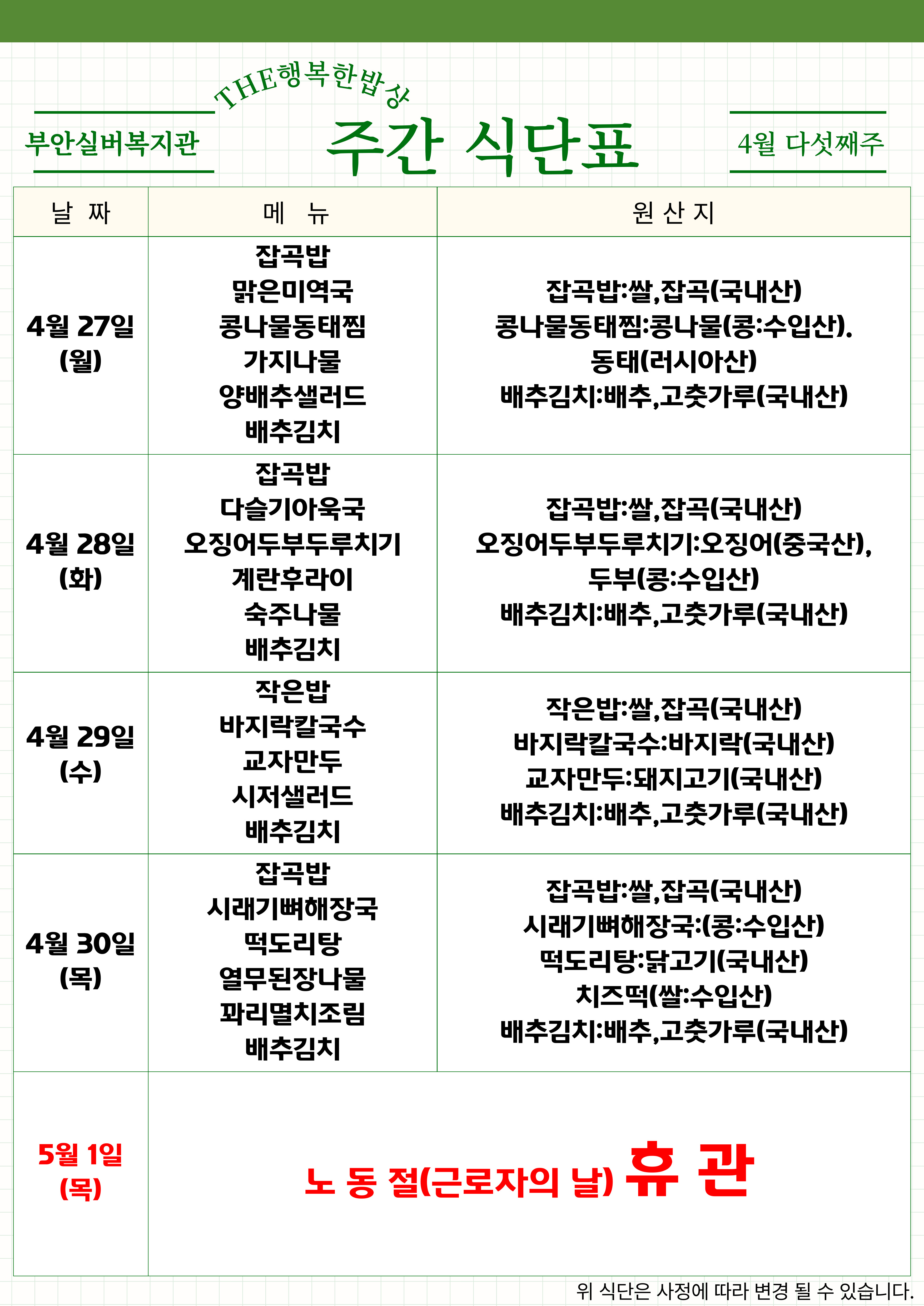 | 복지관 식단표 - 4월 4주 (0) | 2026.04.17 |