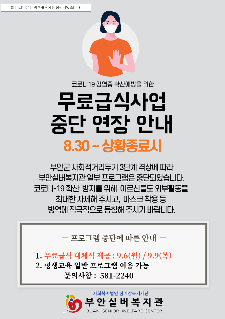 | 부안실버복지관 운영 재개 안내_2021.09.13 (0) | 2021.09.13 |