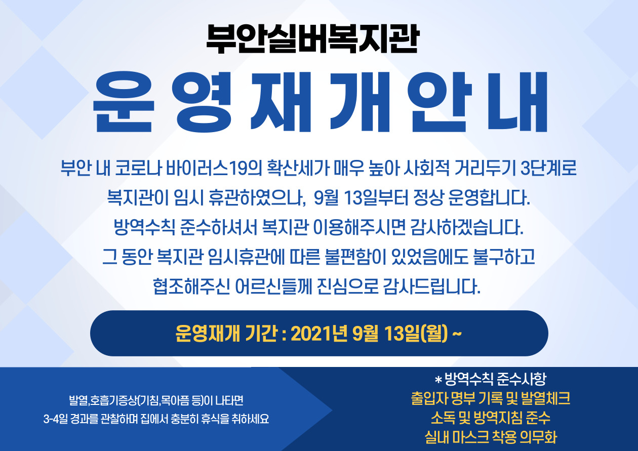 | 코로나-19 감염증 확산방지를 위한 '무료급식사업 중단 연장' 안내 (0) | 2021.09.06 |