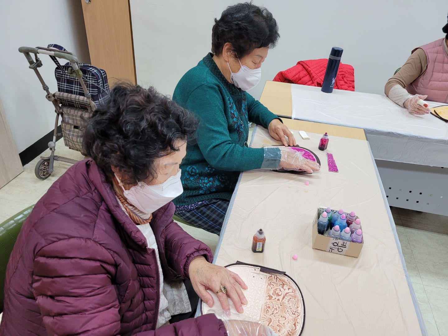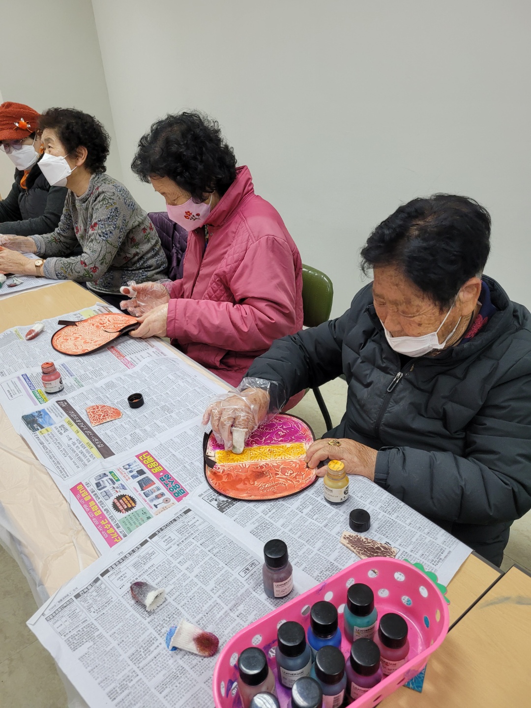 재단된 가죽에 염색약을 이용하여 어르신들 자신만의 가죽을 염색하였고,