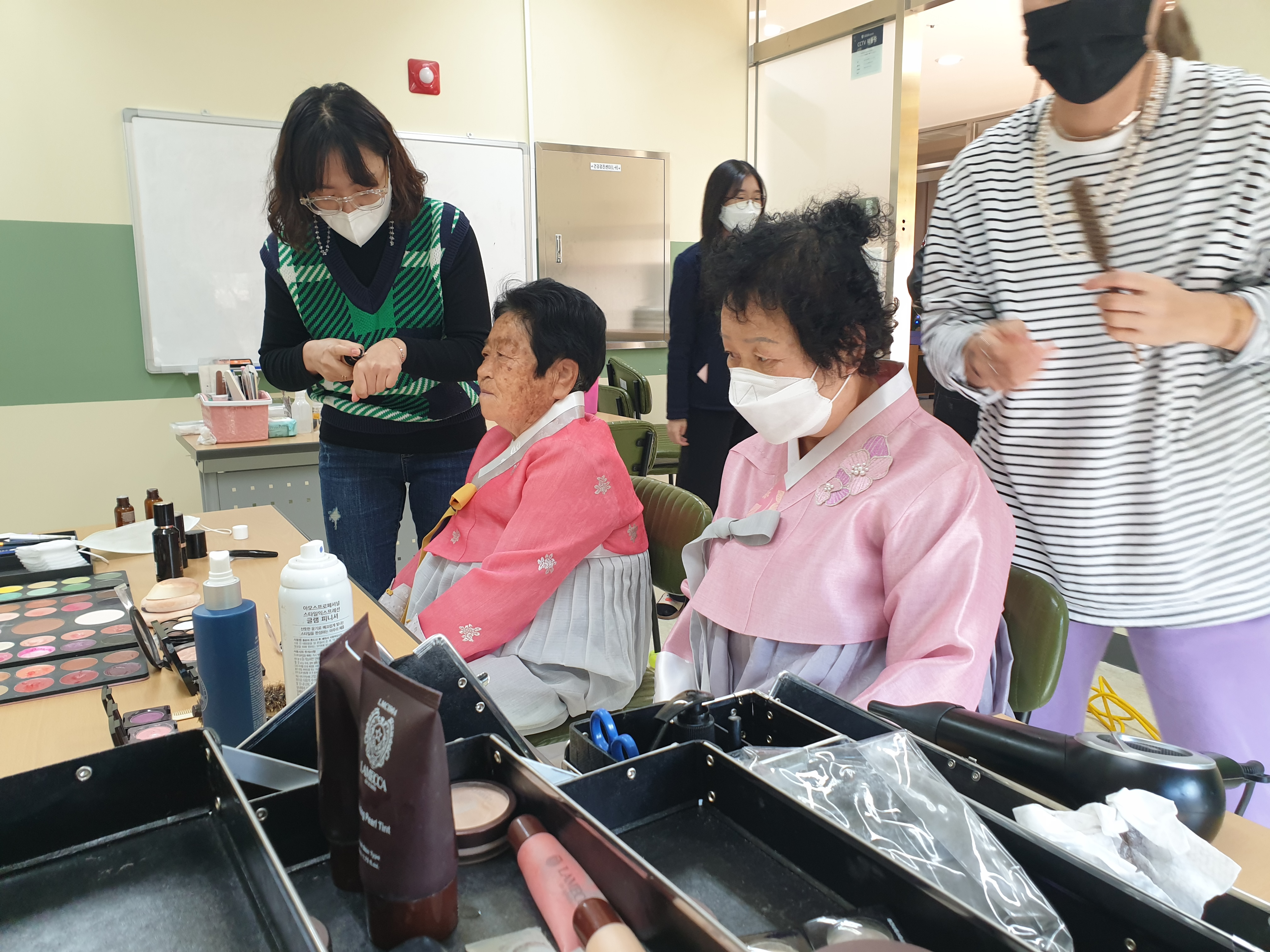 촬영에 들어가기 전 어르신들은 오랜만에 한복을 골라 입고, 화장을 받으시면서, 처음에는 어색해하셨지만, 서로 옆에 분에게 다시 시집가도 되겠다. 라며 장난도 치시고, 예전에 '결혼할 때가 생각난다' 라고 하셨습니다. 또한, 이번 장수사진 촬영은 평소 복지관 프로그램을 이용하는 어르신들과 더불어 면단위에서 거리가 멀어 오기 힘든 어르신들을 자녀 및 마을 이장님들이 함께 모시고와 촬영을 진행했습니다.
