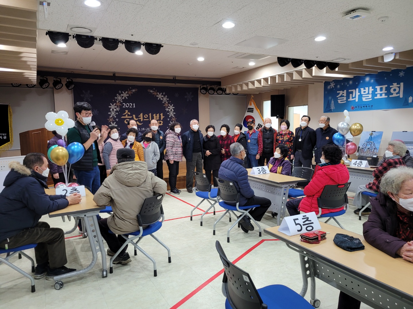 층별로 한해 소감을 나누었습니다. 한해 복지관에서 다양한 프로그램을 준비해 주어 고맙다고 말씀해 주시는 어르신, 새해 덕담을 준비해 말씀해 주신 어르신 등 다양한 이야기가 각 층별로 나왔다. 그 중에서 4층 손00어르신은 지난 2년동안 복지관 프로그램에 참여하지 않다가 최근 들어 조금씩 활동하고 있는데, 복지관에서 정말 필요하고 의미있는 일들을 하고 있다는 것이 느껴져서 좋다고 말씀하시며, 노년생활 혼자 사는 세상이지만, 이웃들과 더불어 즐거운 마음으로 살아갔으면 좋겠다 말씀해 주셨습니다.