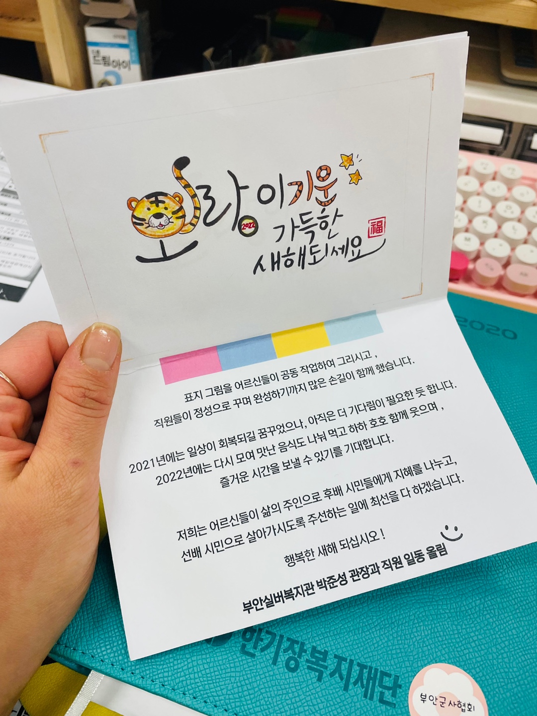 연하장을 받으신 어르신들 중 2021년 평생교육프로그램이 종강되어 복지관에 오지 않으셨던 김○자 어머님께서는 "연하장을 받고 너무 반가우셨다"고 말씀하시며 "호랭이 카드 너무 잘 받았고, 직원들 모두 새해 복 많이 받아요!"라고 덕담을 전해주시려고 기관으로 안부전화를 해주셨습니다.