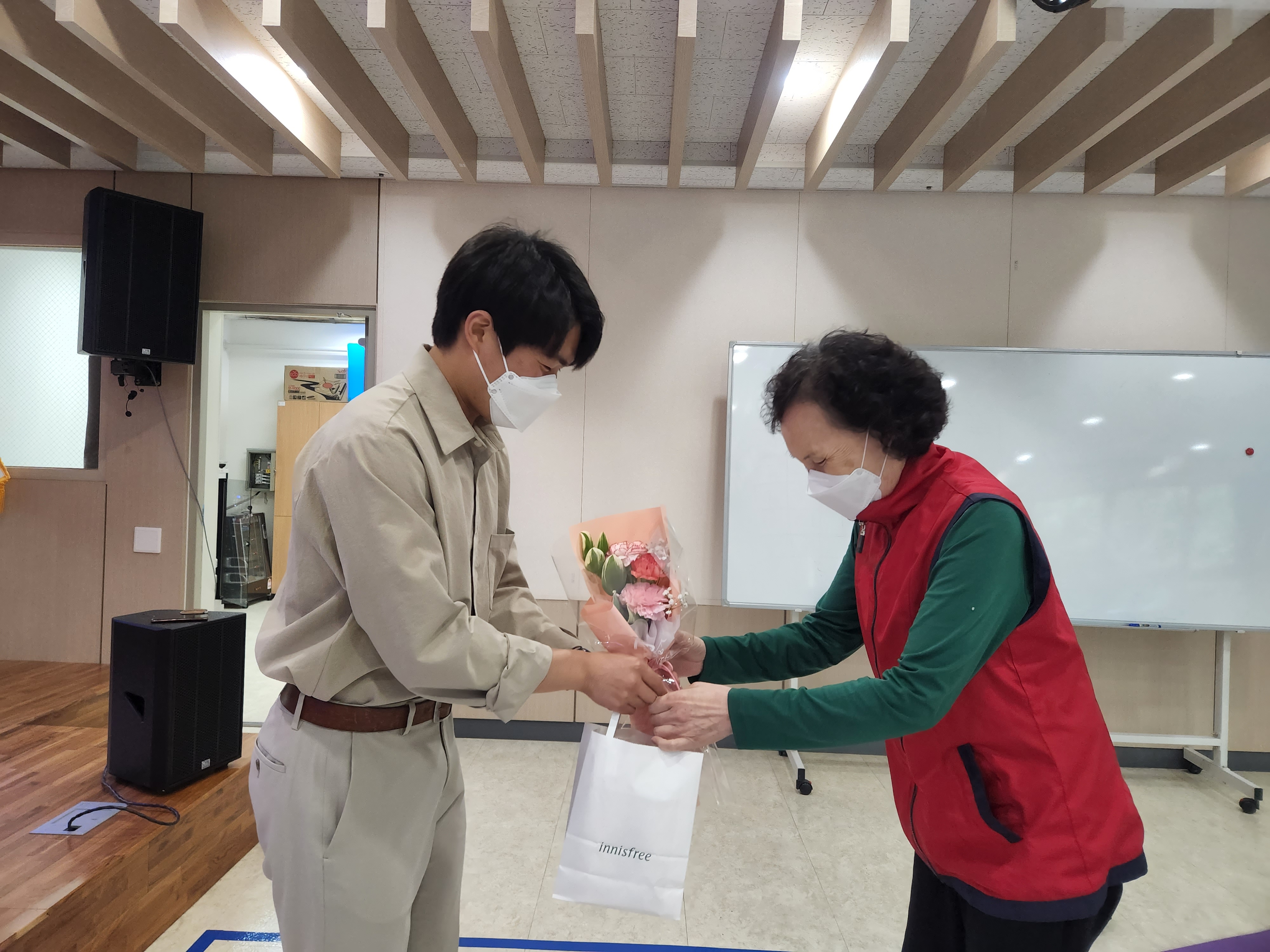 5월 15일 스승의 날을 맞이하여 매트체조, 요가, 한글교실, 생활체조 프로그램 참여 어르신들이 프로그램 선생님들에게 감사의 마음을 전달했습니다. 생각지도 못한 이벤트에 선생님들은 어쩔줄을 몰라하시며 좋아해주셨고, 감사를 전하는 어르신들도 행복해 하셨습니다.