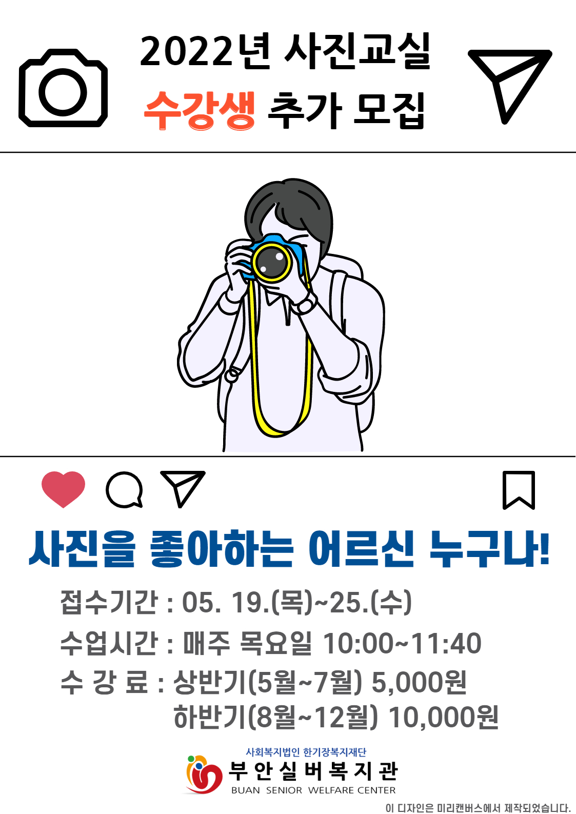 2022년 사진교실을 함께할 어르신을 추가 모집하고 있습니다. 스마트폰을 활용한 사진촬영, 사진구도, 야외출사 등 다양한 활동을 통한 사진 수업을 진행하고 있습니다! 어르신들의 많은 관심과 참여 부탁드립니다!