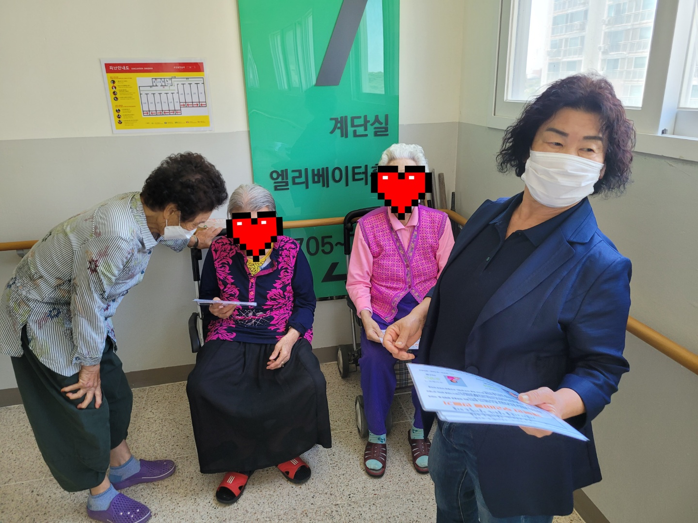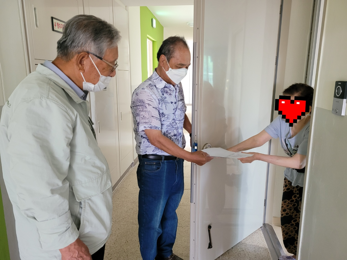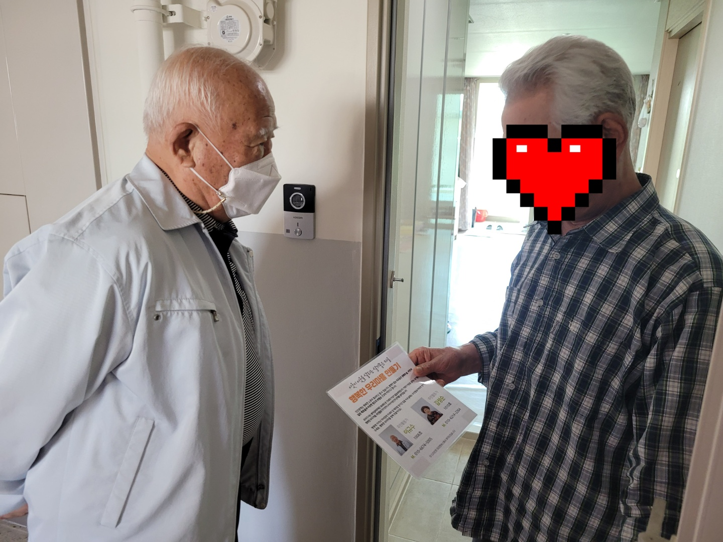 실버주택에는 홀로 거주하시는 어르신들이 많은 만큼 서로가 서로의 안부를 챙기고, 고독사를 예방하고자 주민활동가의 집호수와 연락처가 적힌 명함을 드렸습니다. 이미 명함을 나눠드린 경험이 있으셔서 주민활동가에 대한 설명, 명함을 드리는 이유 등에 대해 자연스럽게 이야기하는 모습들이 참 인상깊었습니다. 이런 활동을 통해 실버주택 이웃주민들이 서로의 자원이 되어 이웃관계망이 강화되는 계기가 되었으면 좋겠습니다.
