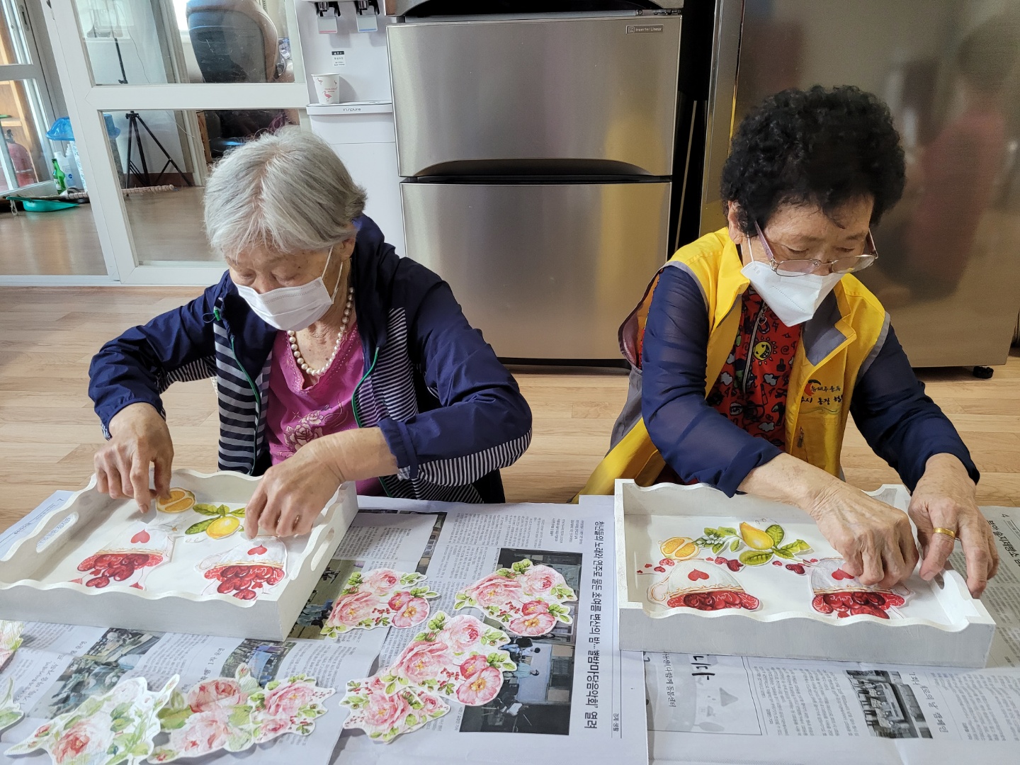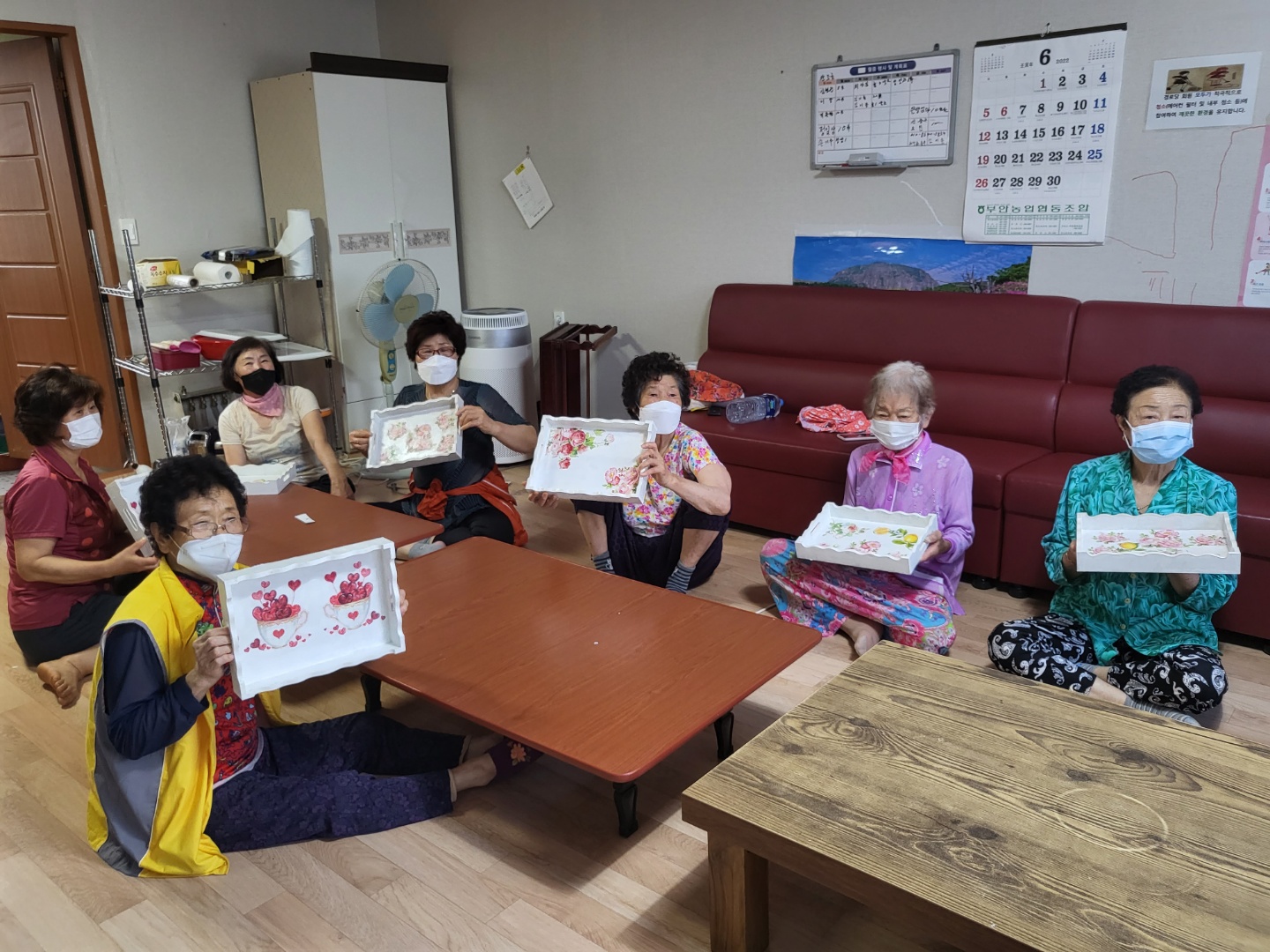 코로나로 지친 어르신들의 마음을 위로하고자 '노인복지관 연계사업 - 심리정서지원 프로그램  넵킨아트 트레이 만들기'를 준비하였습니다. 지난 5월31일 진행한 안성1경로당을 시작으로 총 12개 경로당에서 어르신들을 만날 예정입니다.